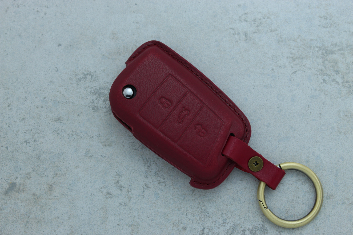 Чохол для автоключа Volkswagen 3 кнопки Passat червоний шкіряний — яскравий та надійний аксесуар, що захищає ключ від подряпин, зносу та щоденних пошкоджень.