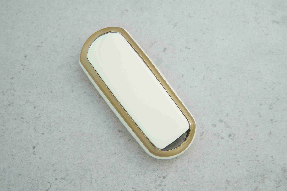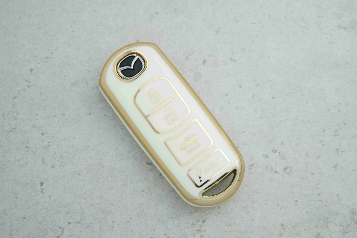 Чохол для автоключа Mazda білий із золотими вставками, поліуретан, 4 кнопки (Smart CX-3, CX-5, CX-7, CX-8, CX-9) — стильний та надійний аксесуар, що захищає ключ від подряпин, потертостей і щоденного зносу, зберігаючи його елегантний вигляд.