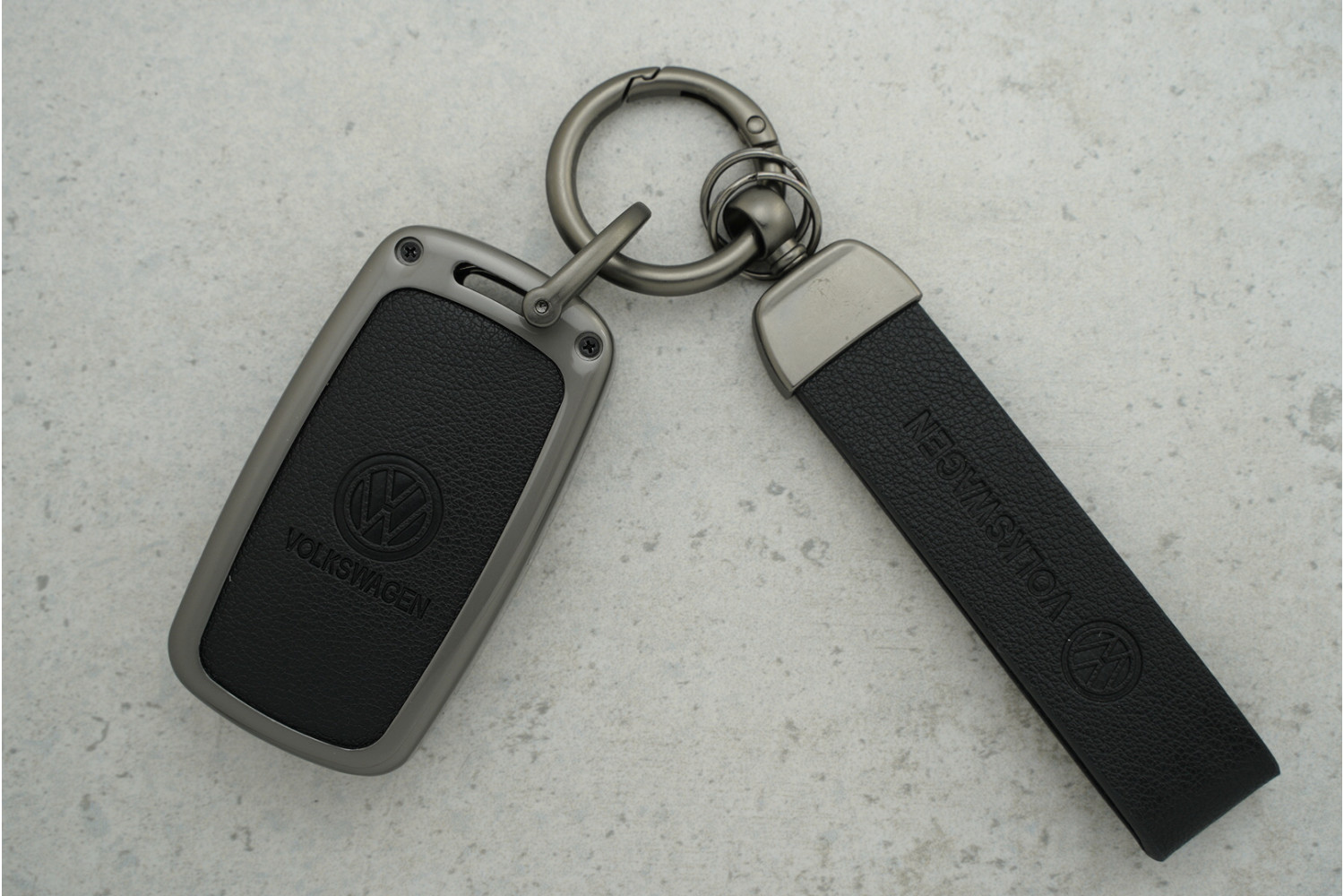 Чохол для автоключа Volkswagen 3К / Skoda Passat B5/6/7 / Golf чорного кольору з шкіри та металевими вставками — універсальний аксесуар, що захищає ключ від подряпин, потертостей і щоденного зносу, поєднуючи надійність і стильний вигляд.