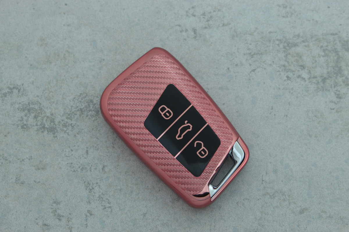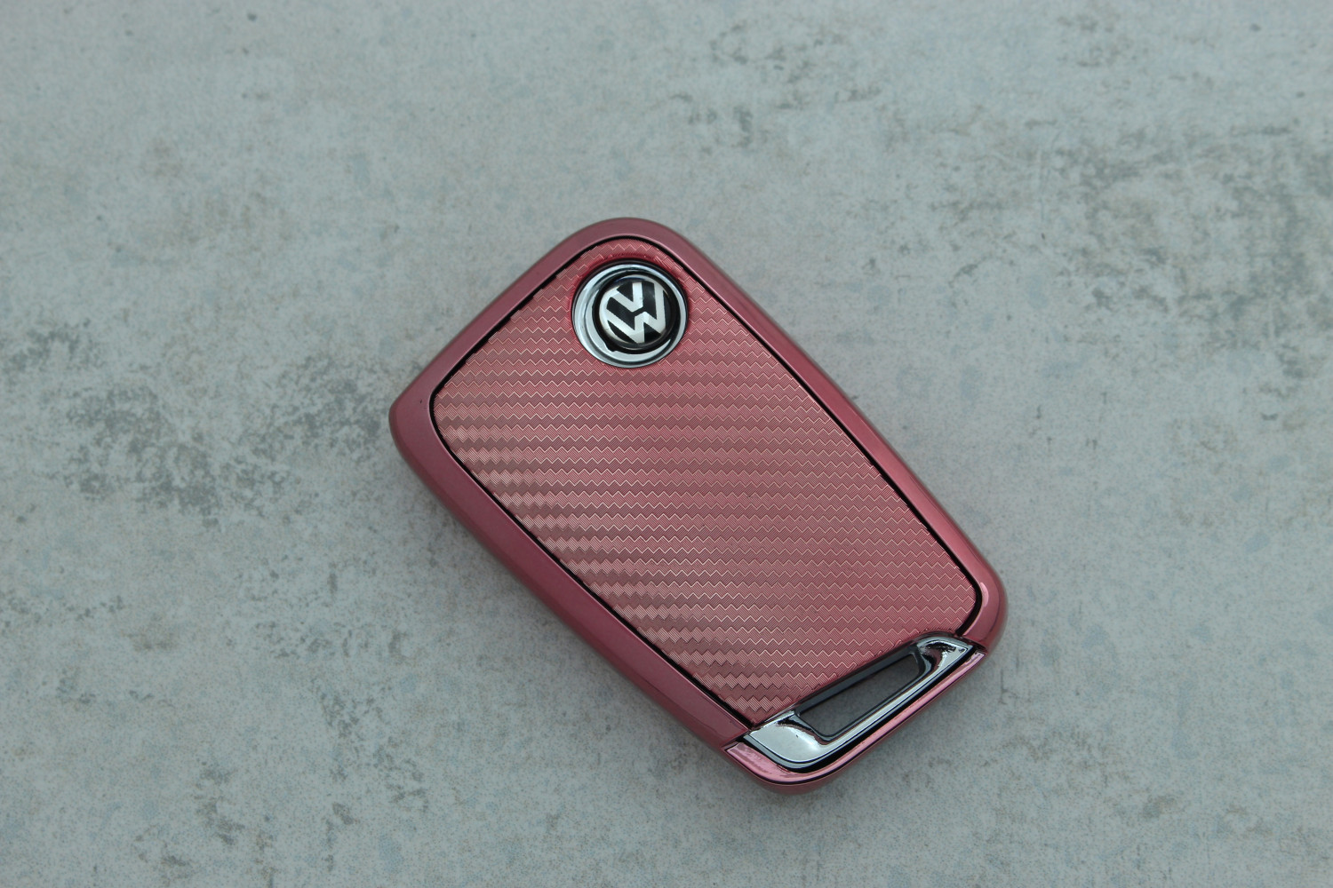 Чохол для автоключа Volkswagen 3 кнопки Smart рожевий поліуретановий з карбоновим ефектом — яскравий та практичний аксесуар, який надійно захищає ключ від подряпин, ударів та щоденного зносу.