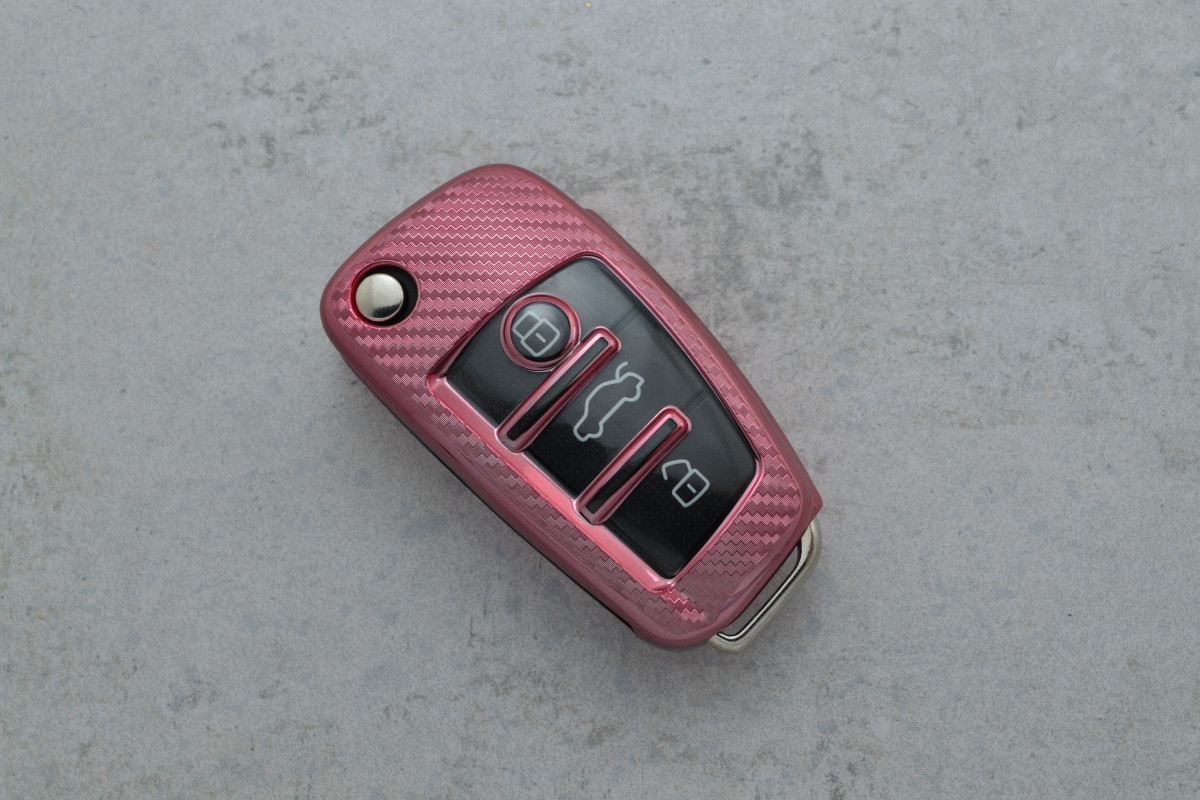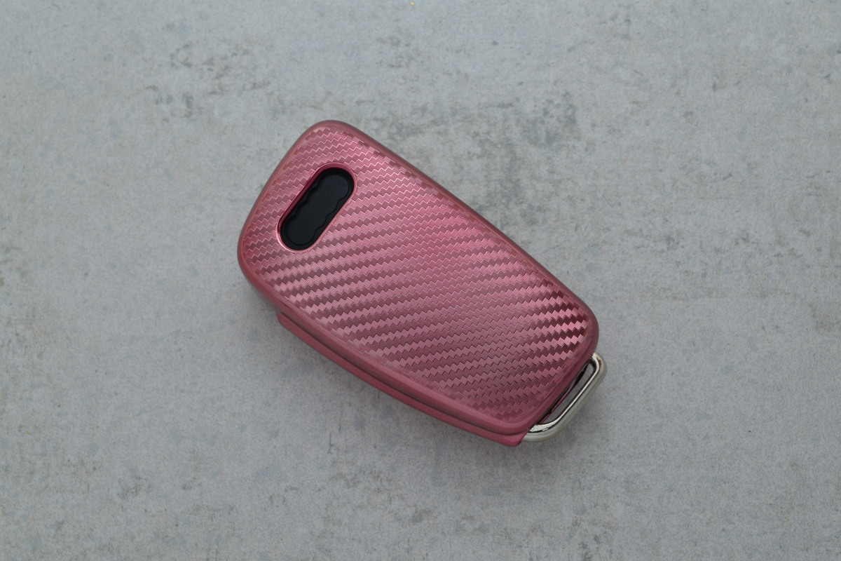 Чохол для автоключа Chery та Audi A4, A4L, A6, A6L, Q2L, Q3, Q5, Q7 рожевий карбон поліуретан — стильний і практичний аксесуар, який захищає ключ від подряпин, зносу та щоденних пошкоджень, надаючи йому сучасного та ефектного вигляду.