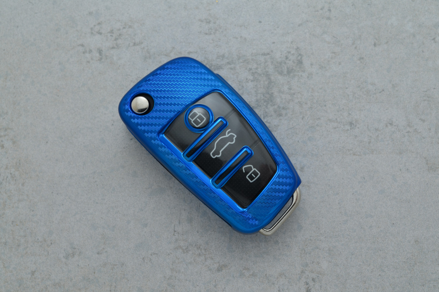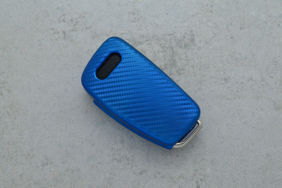 Чохол для автоключа Chery та Audi (A4, A4L, A6, A6L, Q2L, Q3, Q5, Q7) синій карбон поліуретан — стильний та надійний аксесуар, який захищає ключ від подряпин, зносу та щоденних пошкоджень, підкреслюючи його сучасний вигляд.