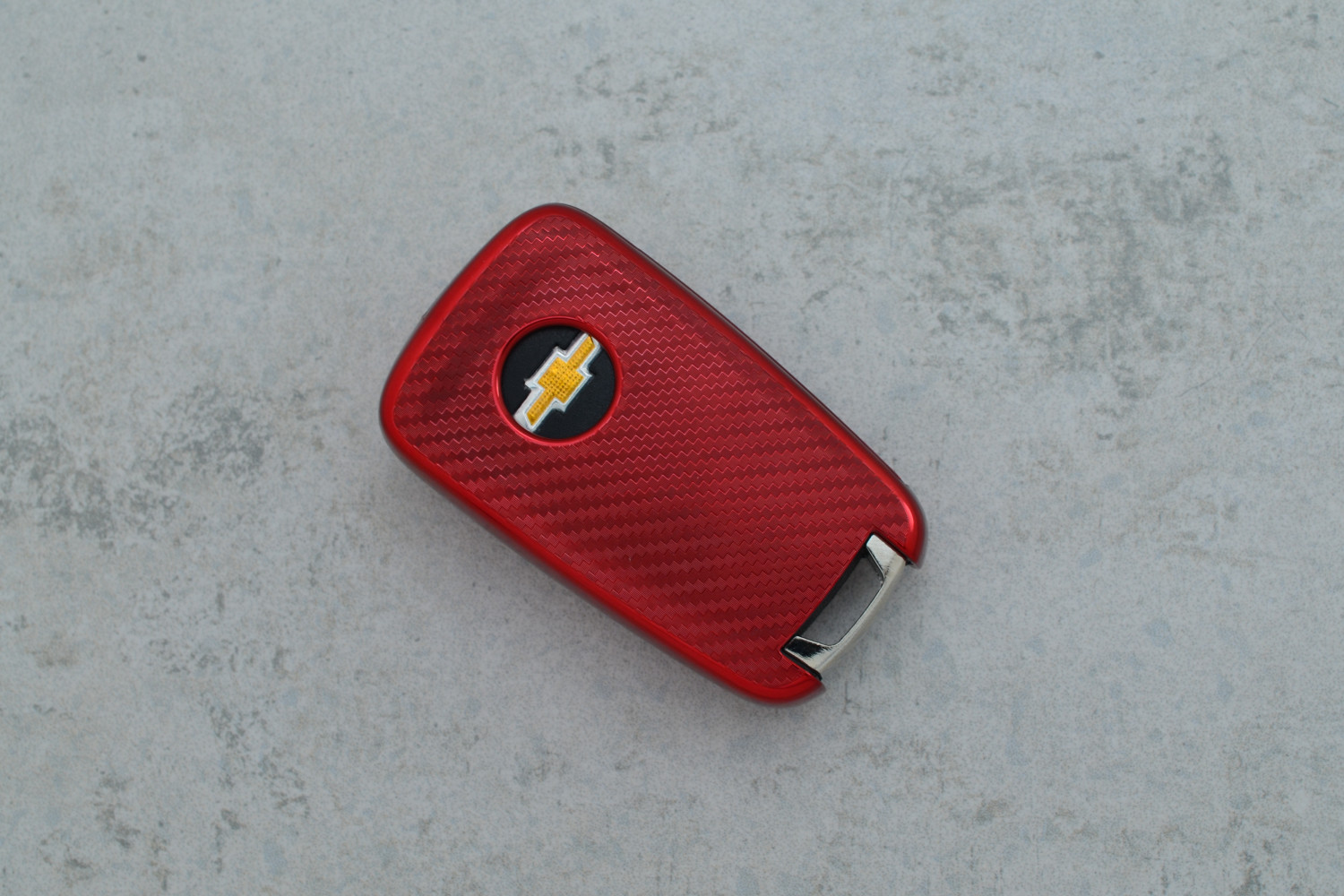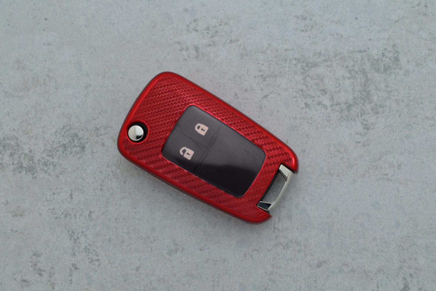 Чохол для автоключа Chevrolet (Aveo, Sonic, Camaro) 2 кнопки червоний карбон поліуретан — яскравий та надійний аксесуар, який захищає ключ від подряпин, зносу та щоденних пошкоджень, додаючи йому сучасного вигляду.