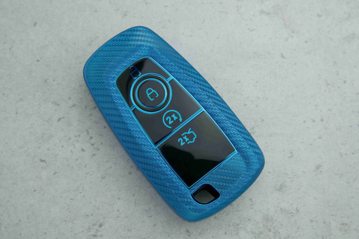 Чохол для автоключа Ford (Fusion/Explorer/Edge/Ranger) синій поліуретан з карбоновою текстурою, 4 кнопки — надійний аксесуар, який захищає ключ від подряпин, потертостей та щоденного зносу, одночасно додаючи йому сучасного вигляду.