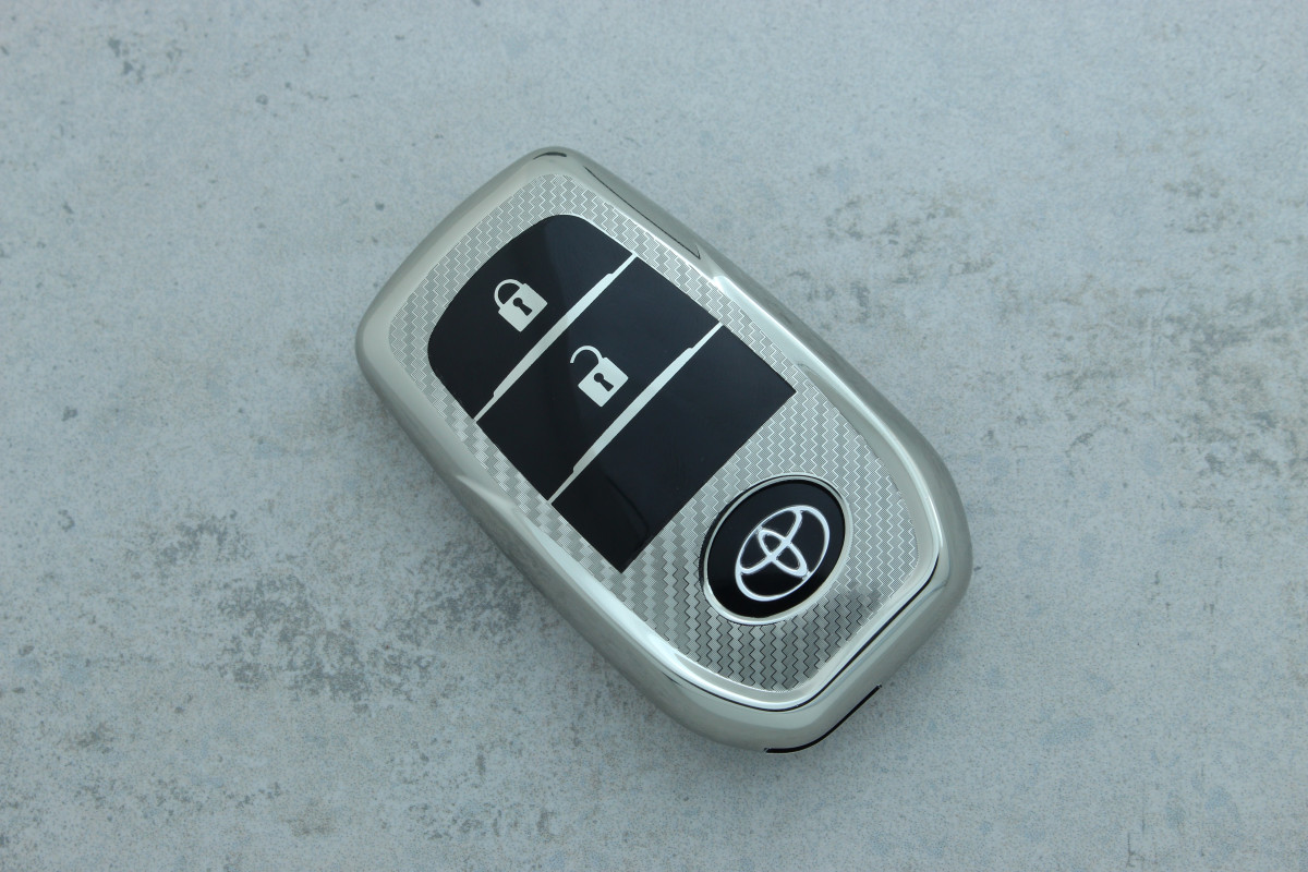 Чохол для автоключа Toyota 2 кнопки Land Cruiser карбон срібний поліуретан — стильний та міцний аксесуар, що надійно захищає ключ від подряпин, зносу та щоденних пошкоджень, додаючи солідного вигляду.