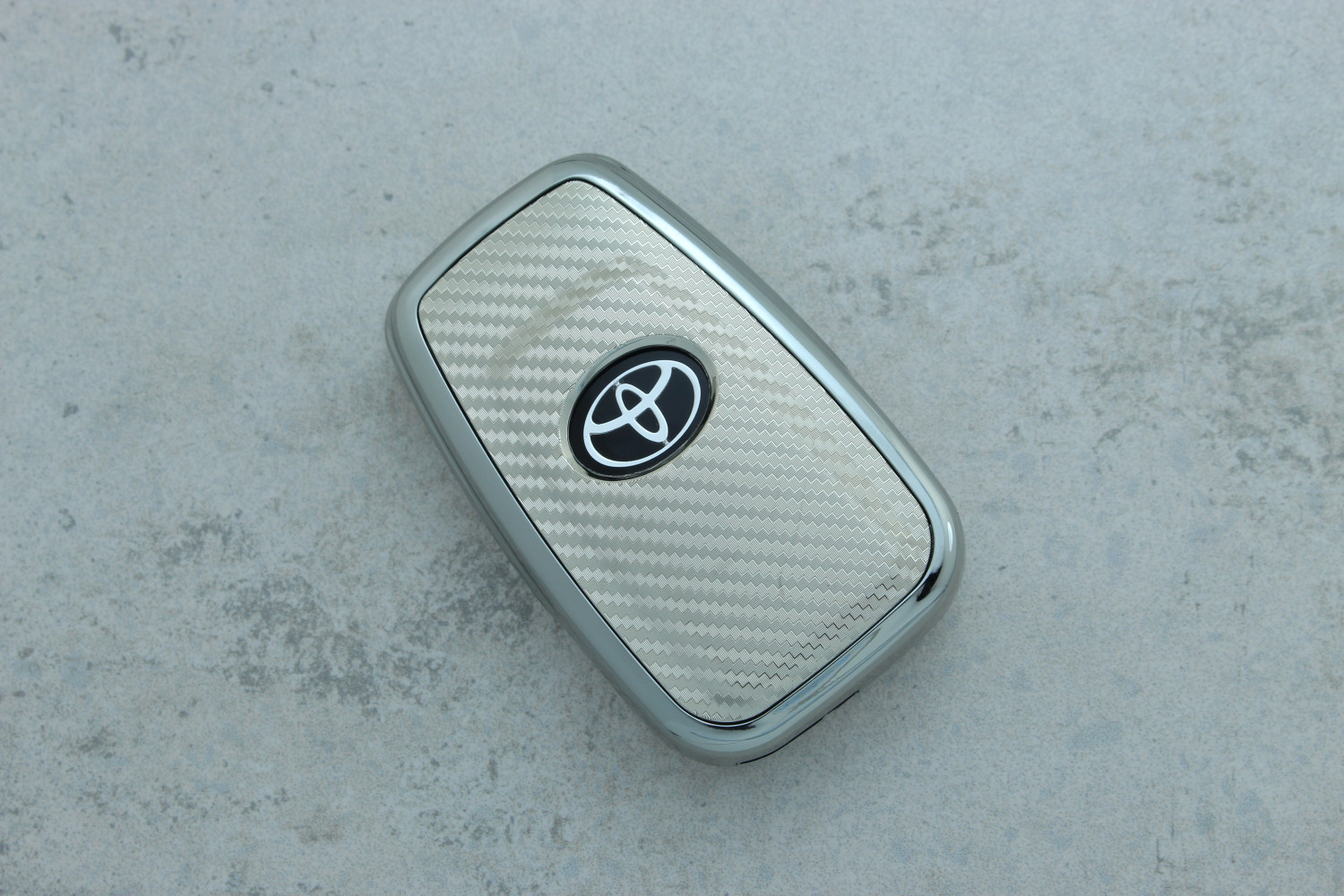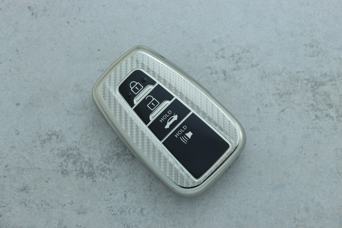 Чохол для автоключа Toyota 4 кнопки Camry/Corolla карбон-срібло поліуретан — міцний і стильний аксесуар, який захищає ключ від подряпин, ударів та щоденного зношування, підкреслюючи сучасний дизайн автомобіля.