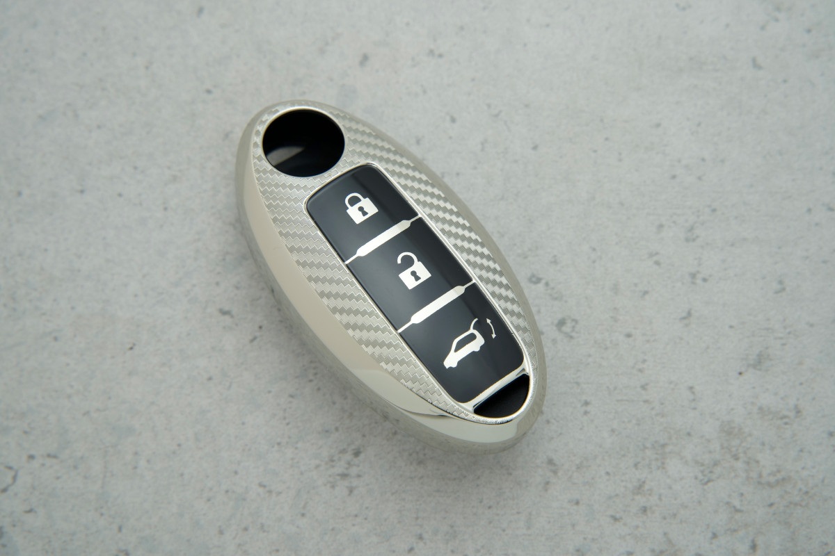 Чохол для ключа Nissan з 3 кнопками та карбоновим срібним поліуретаном надійно захищає пристрій і робить його більш привабливим, поєднуючи стиль та практичність у щоденному користуванні.