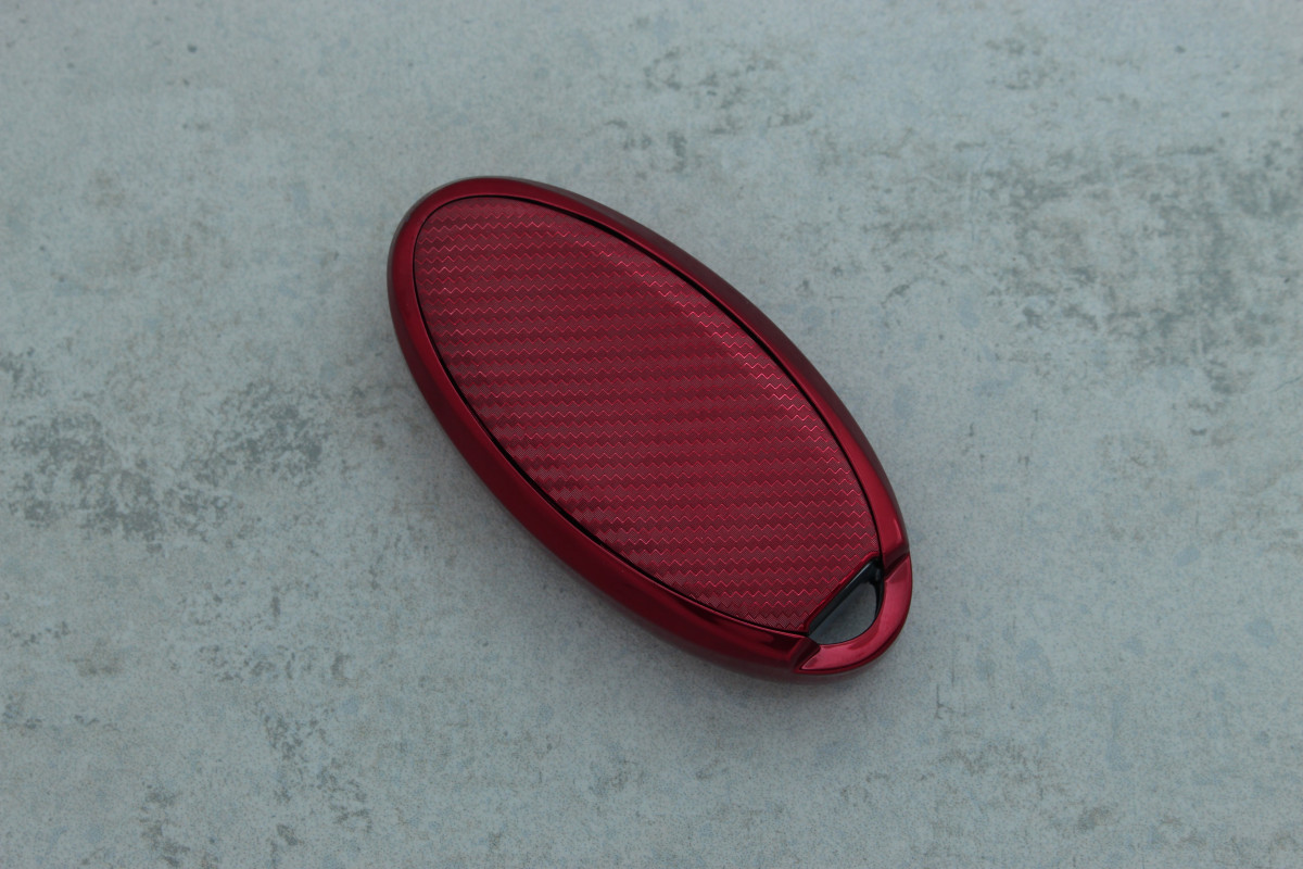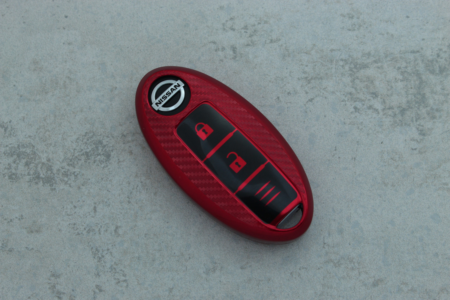 Чохол для автоключа Nissan 2 кнопки (Qashqai J10/J11, Juke, X-Trail) червоний поліуретановий з карбоновим покриттям — стильний та міцний аксесуар, що оберігає ключ від подряпин, ударів і щоденного зносу.
