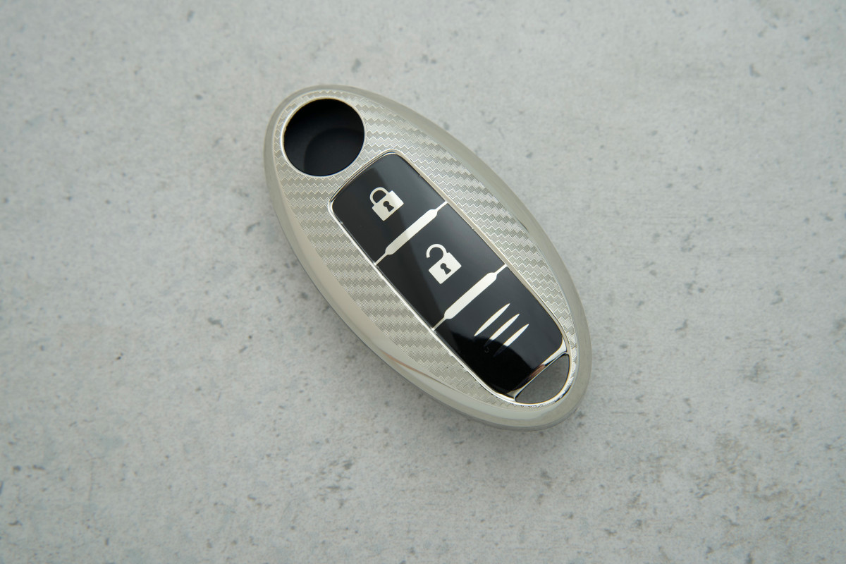 Чохол для ключа Nissan (Qashqai, Juke J10/J11, X-Trail) з 2 кнопками — стильний і практичний захист вашого ключа, виконаний зі срібного поліуретану з карбоновою текстурою, що додає сучасного вигляду та забезпечує надійність щоденного використання.