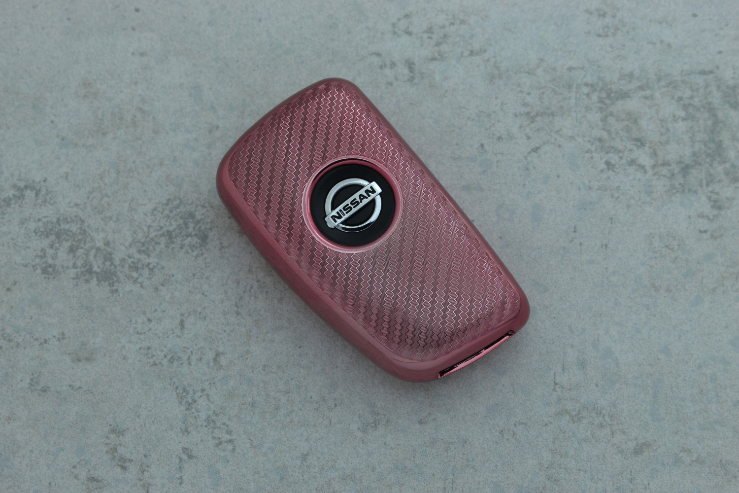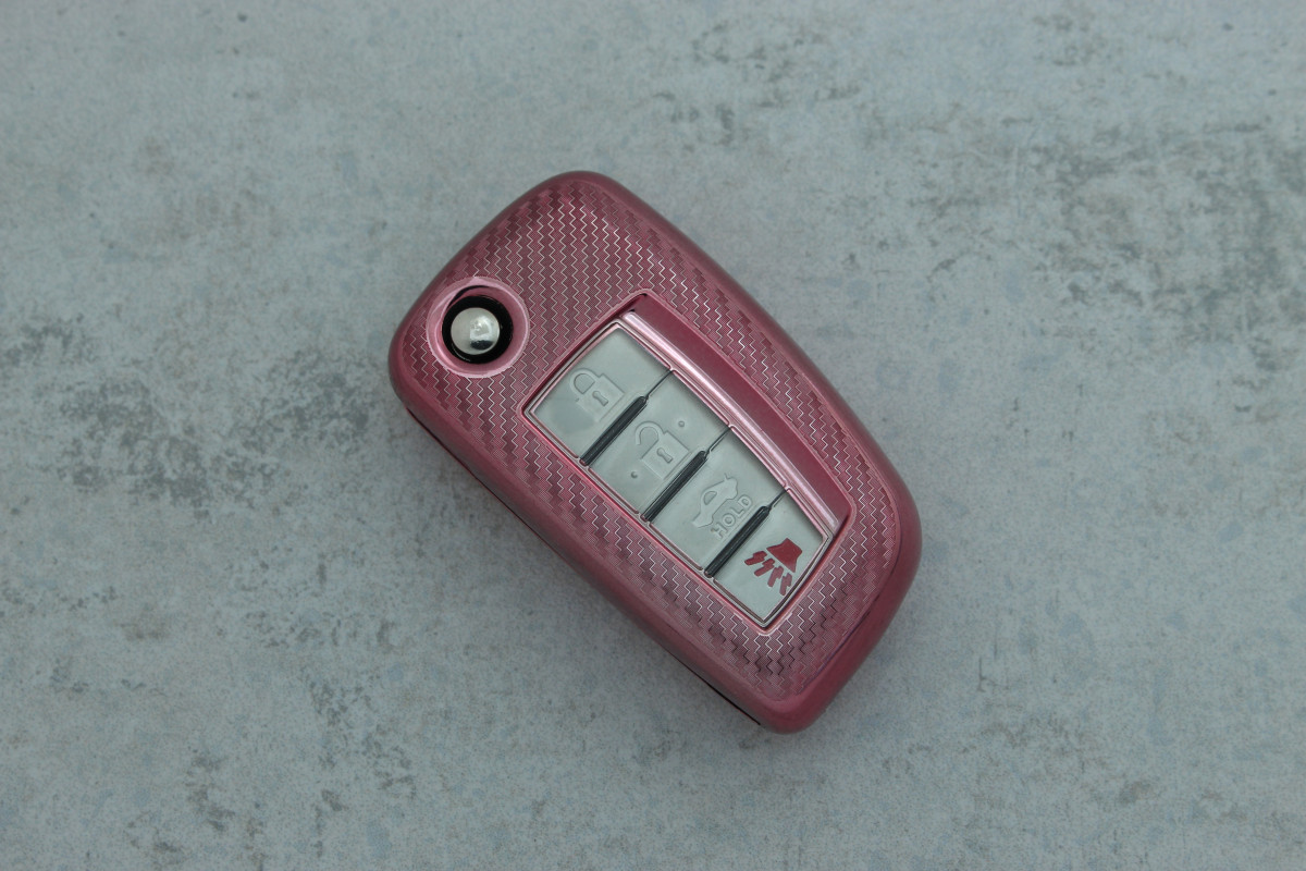 Чохол для автоключа Nissan 4 кнопки (Sylphy, Liwei, Sunshine, Venucia, Tiida) рожевий поліуретановий з візерунком карбону — стильний та практичний аксесуар, що захищає ключ від подряпин, ударів і щоденного зносу.