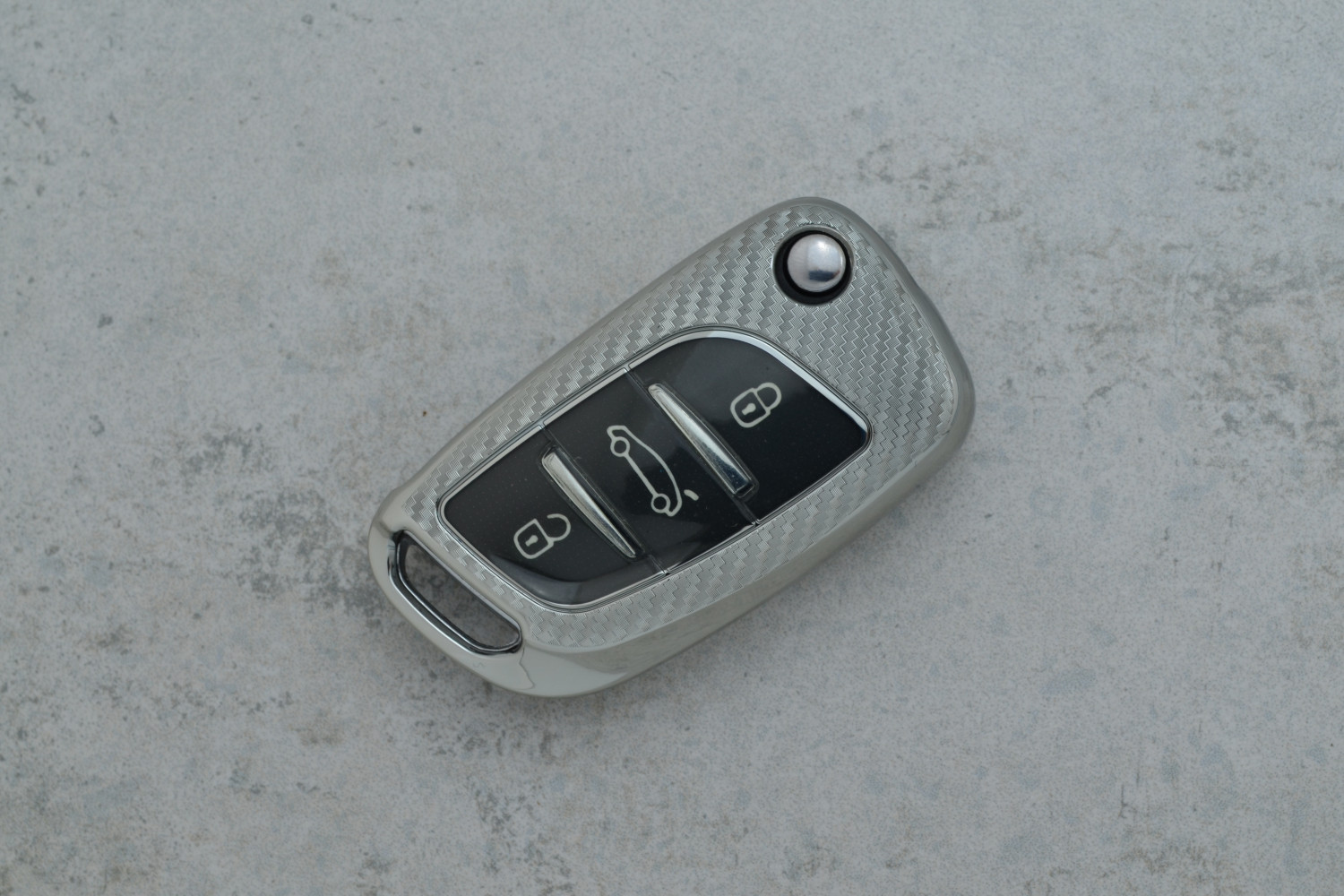 Чохол для автоключа Peugeot 3 кнопки срібний карбоновий поліуретан — сучасний і надійний аксесуар, що ефективно захищає ключ від подряпин, зносу та щоденних пошкоджень.