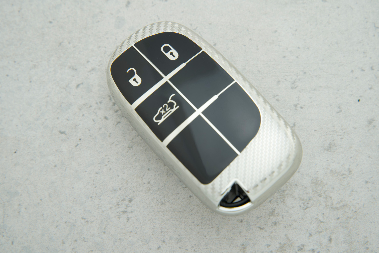 Чохол для автоключа Jeep / Cherokee / Dodge / Chrysler — витончений аксесуар зі сріблястим карбоновим ефектом, виготовлений із міцного поліуретану. Він забезпечує надійний захист ключа від подряпин, потертостей, пилу та ударів, зберігаючи при цьому елегантний зовнішній вигляд.
