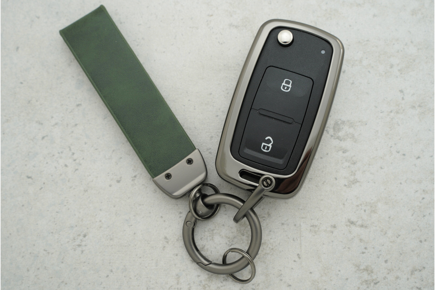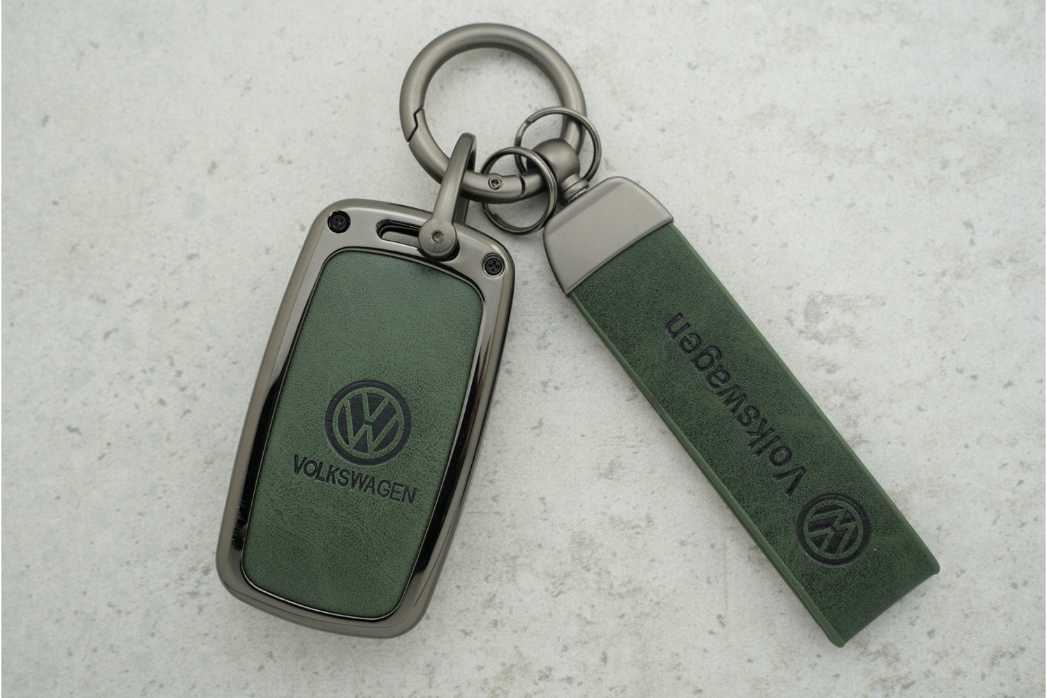 Чохол для автоключа Volkswagen 3 кнопки / Skoda Passat B5/6/7 / Golf із зеленої шкіри та металевими вставками — універсальний аксесуар, що захищає ключ від подряпин, потертостей та щоденного зносу, поєднуючи практичність і стильний вигляд.