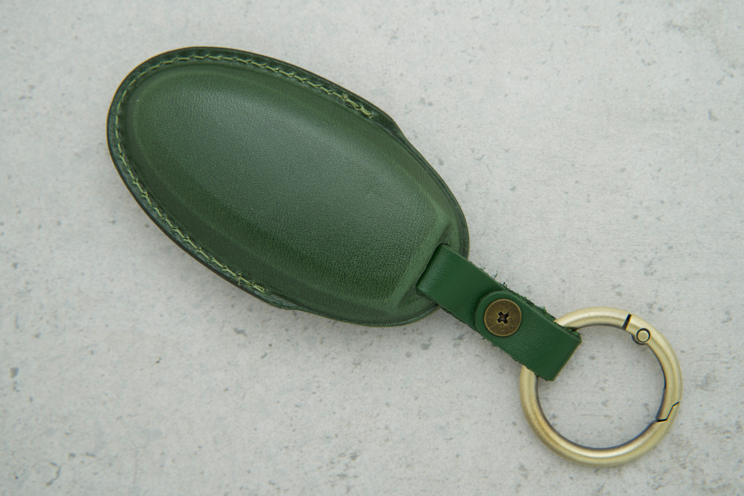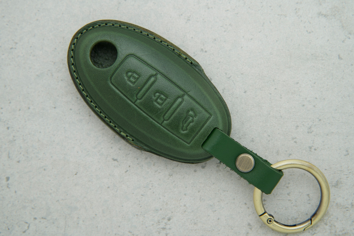 Чохол для ключа Nissan X-Trail та Rogue з трьома кнопками, виконаний зі шкіри насиченого зеленого кольору — стильний та надійний аксесуар, який захищає ключ від подряпин, потертостей і пилу.