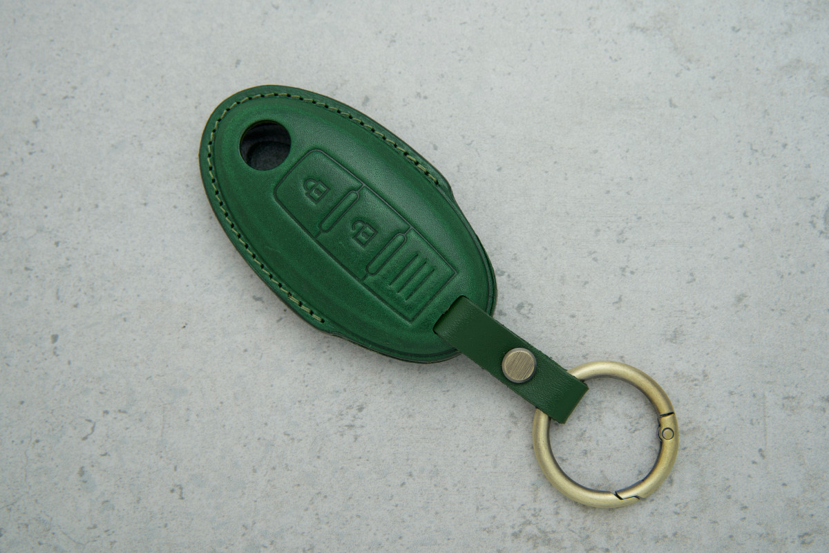 Чохол для ключа Nissan зі зеленою шкірою поєднує захист і стиль, роблячи ключ більш привабливим та зручним у щоденному використанні.