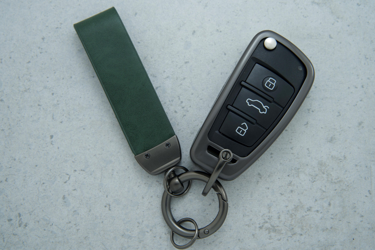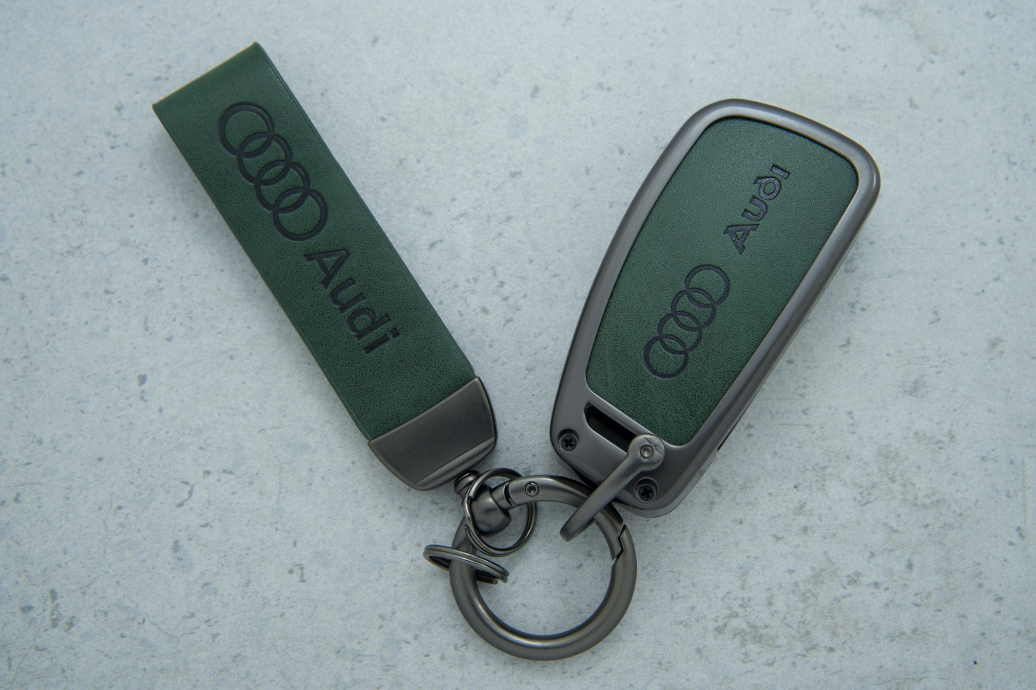 Чохол для автоключа Audi A4/A4L/A6/A6L/Q2L/Q3/Q5/Q7 графітовий метал із зеленою шкірою — сучасний і надійний аксесуар, який захищає ключ від подряпин, зносу та щоденних пошкоджень.