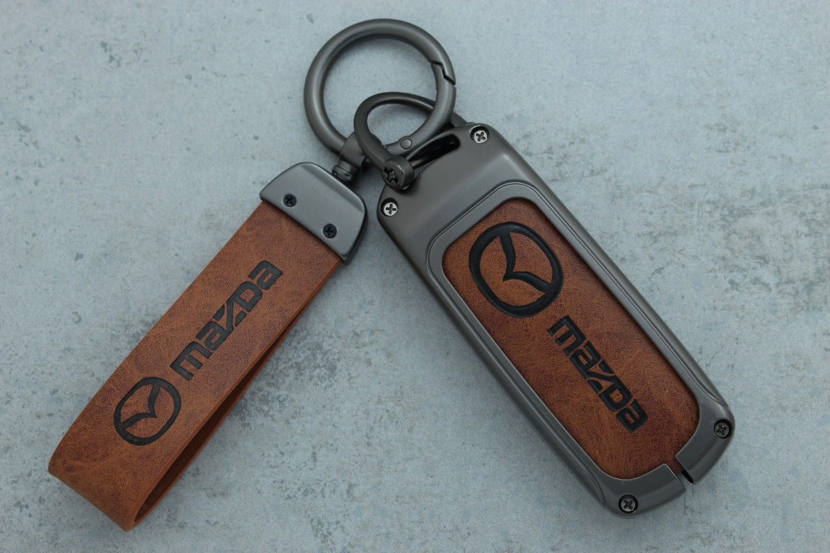 Чохол для автоключа Mazda 3 кнопки Smart CX4/CX5 графітовий метал з коричневою шкірою — преміальний аксесуар, що поєднує міцність і стиль, забезпечуючи надійний захист ключа від подряпин, потертостей і щоденного зносу.