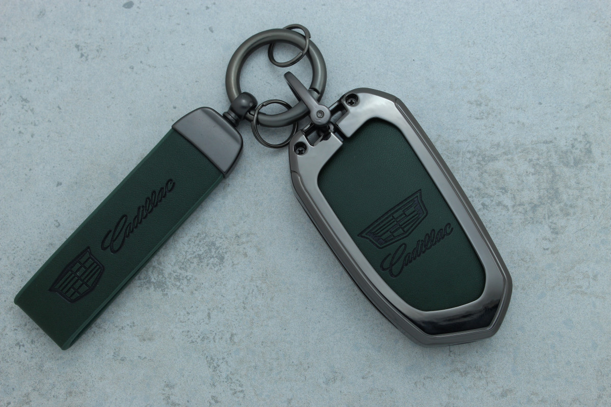 Чохол для автоключа Cadillac Smart 5 кнопок зелений шкіряний з графітовим металевим акцентом — стильний та міцний аксесуар, що захищає ключ від подряпин, ударів та щоденного зносу.