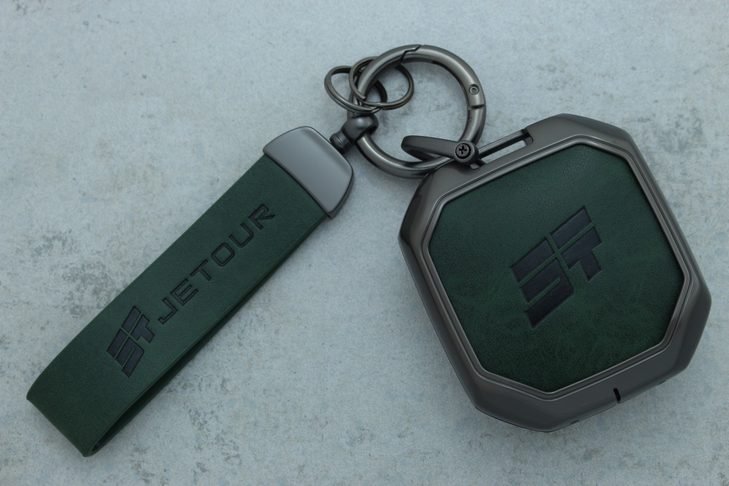 Чохол для автоключа Chery/Jetour T1, T2, T3, TX зелена шкіра з сірим металевим ефектом — практичний і стильний аксесуар, що захищає ключ від подряпин, ударів та щоденного зносу.