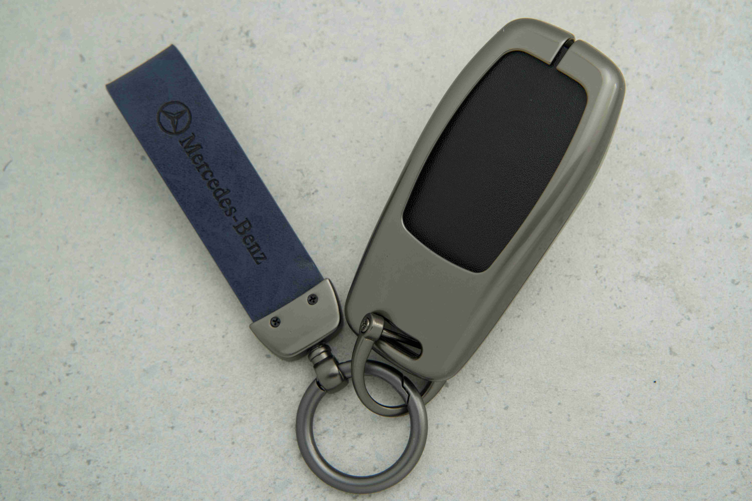 Чохол для автоключа Mercedes Smart (3 кнопки) — сірий метал + синя шкіра — елегантний і функціональний аксесуар, що забезпечує надійний захист ключа від подряпин, потертостей та щоденних ушкоджень. Поєднання металу та шкіри створює преміальний вигляд і приємні тактильні відчуття.