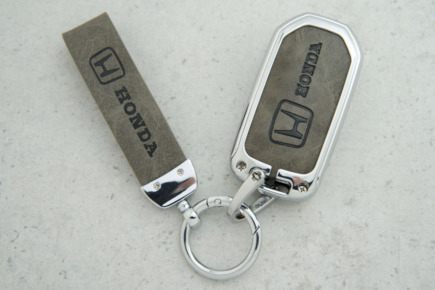 Сучасний дизайн: сіра шкіра з металевими акцентами надає ключу елегантного та преміального вигляду.