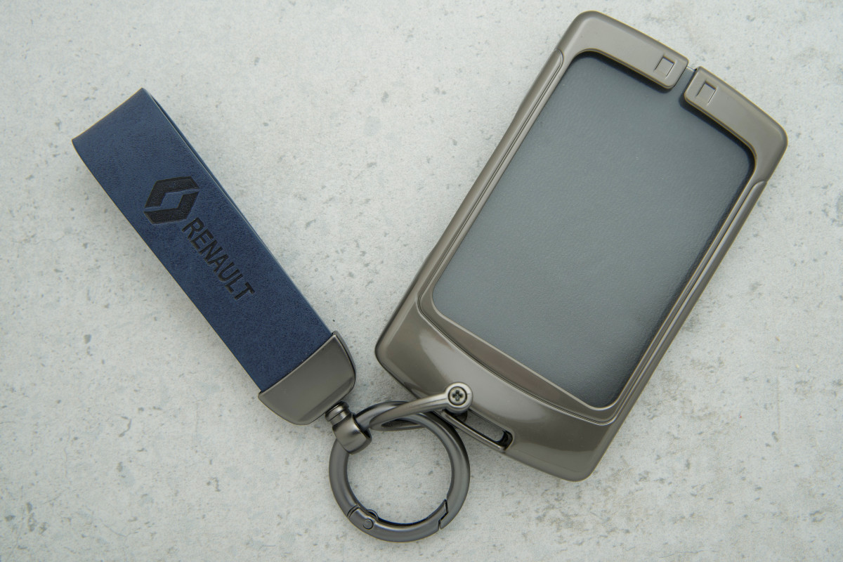 Стильний дизайн: синя шкіра в поєднанні з сірим металом надає ключу елегантного та преміального вигляду.