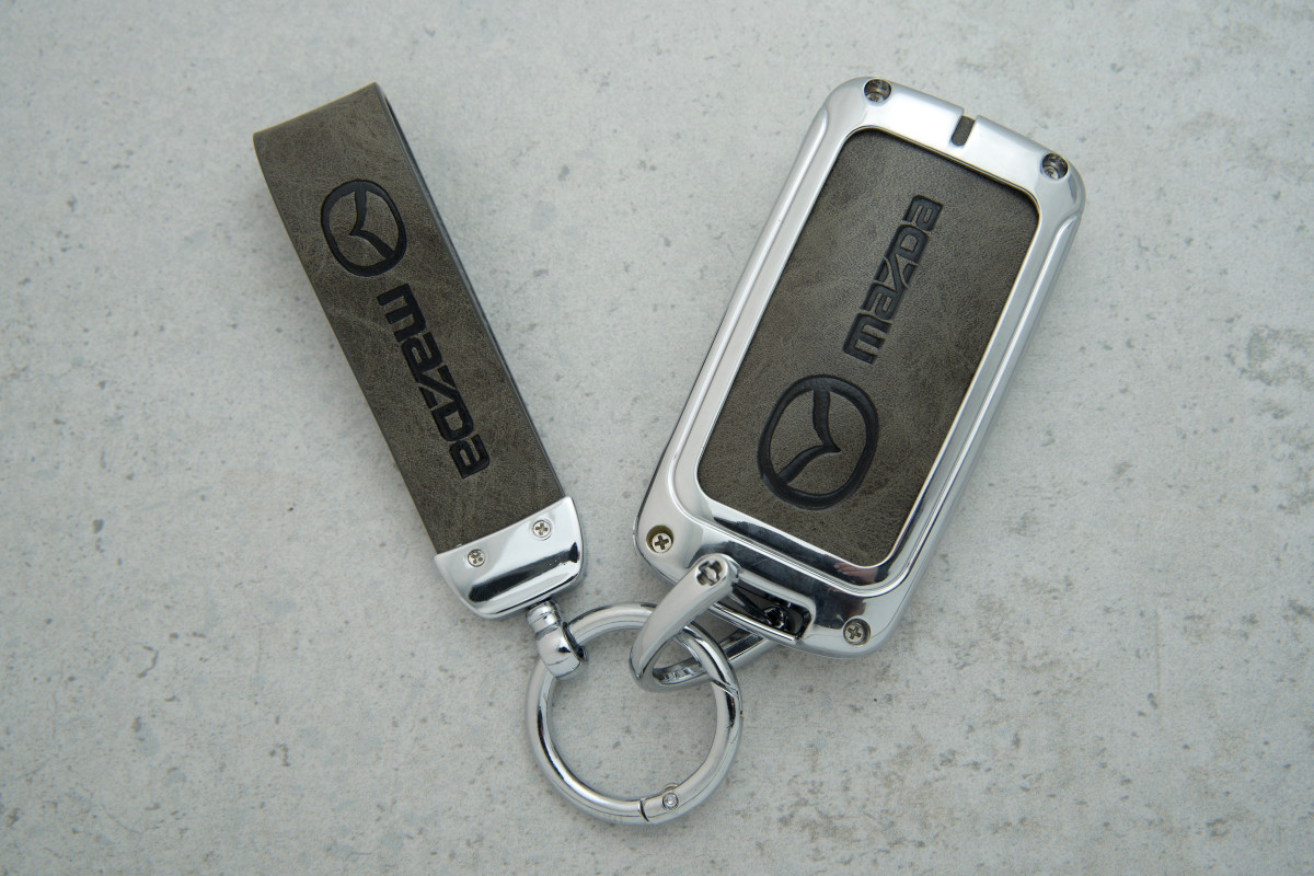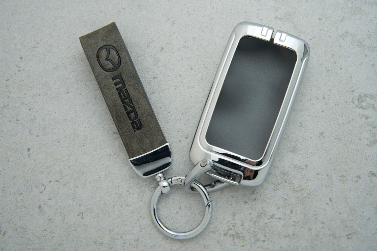 Чохол для ключа Mazda універсальний — витончений аксесуар, виготовлений із поєднання сірої шкіри та металу. Його дизайн поєднує елегантність і практичність, забезпечуючи надійний захист ключа від подряпин, пилу та механічних пошкоджень.