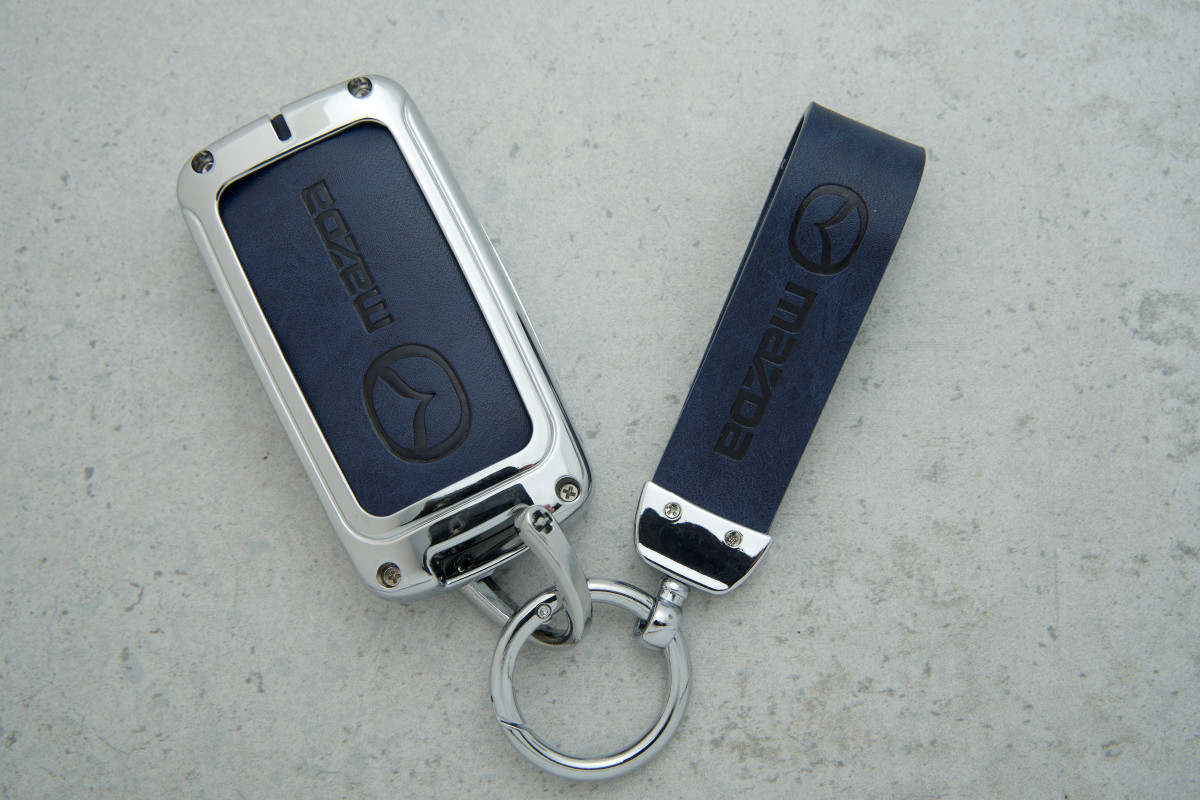 Чохол для ключа Mazda універсальний — стильне рішення для захисту автомобільного ключа, виконане з поєднання синьої шкіри та металу.