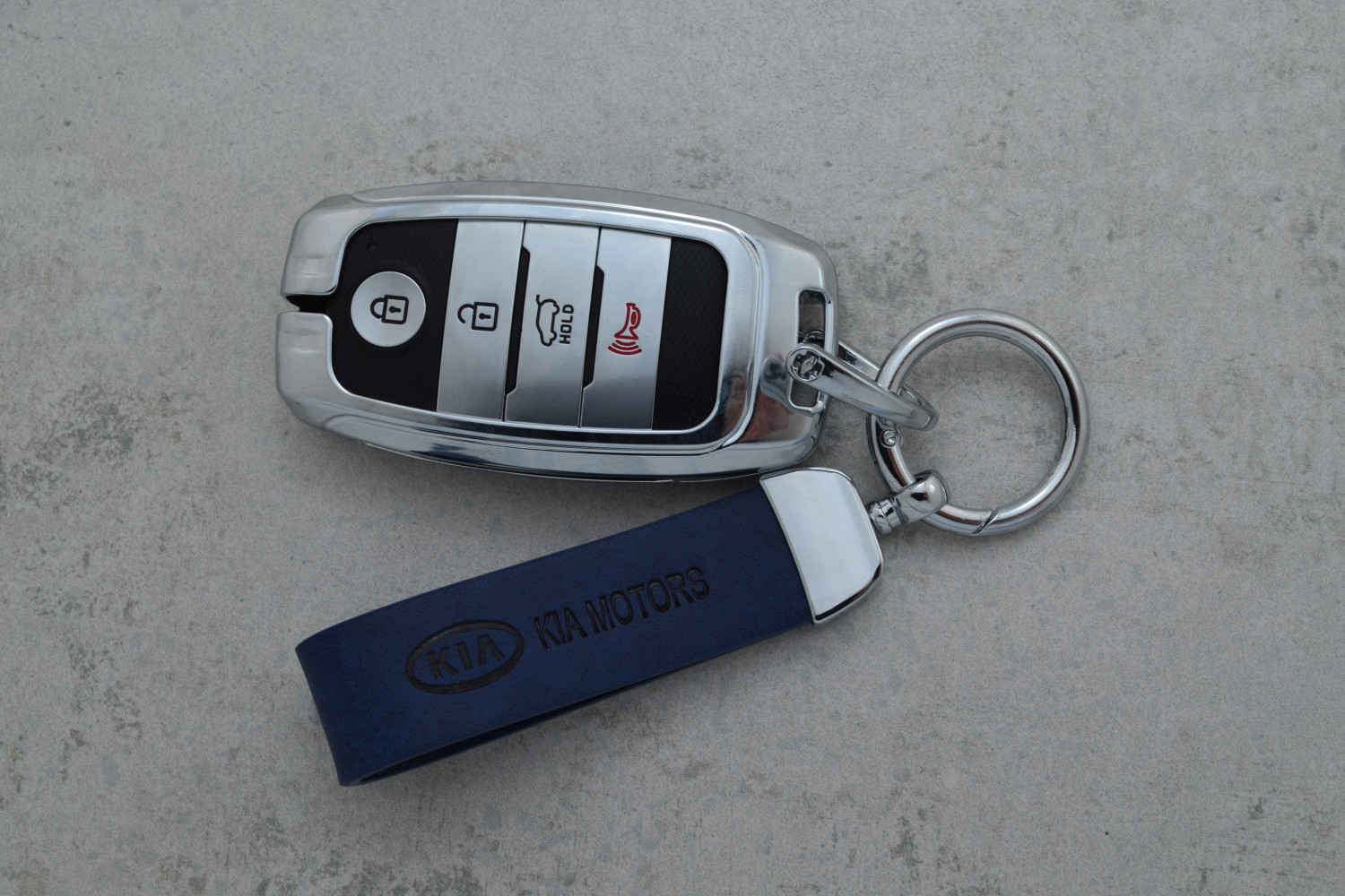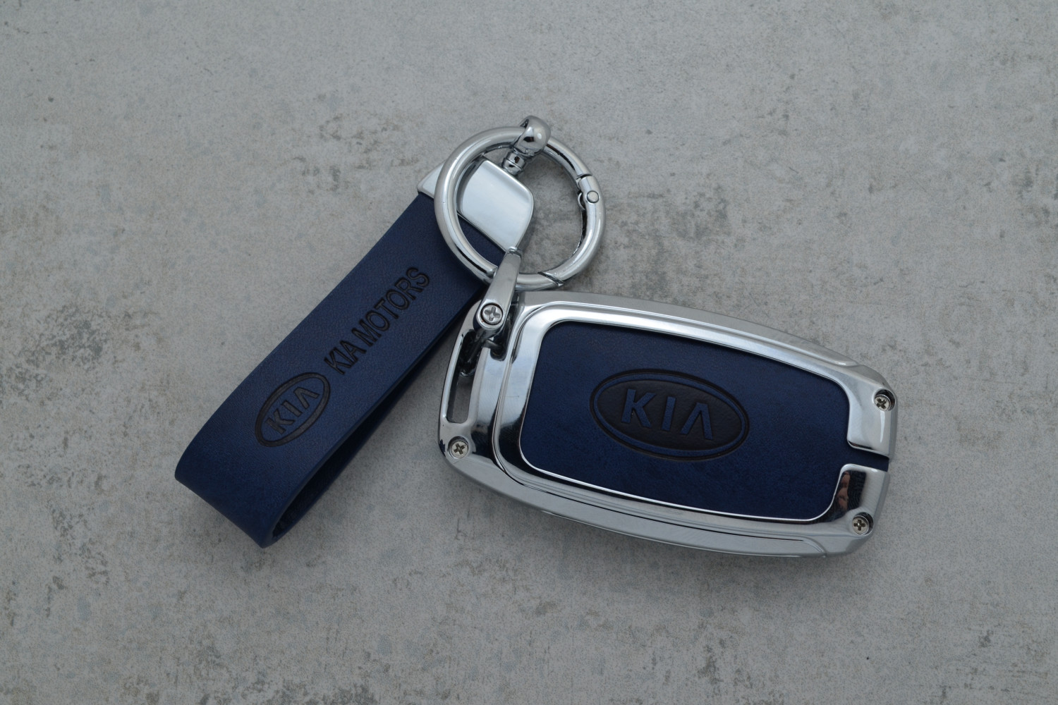 Сучасний дизайн: поєднання металу та насиченого синього кольору шкіри надає ключу елегантного та преміального вигляду.