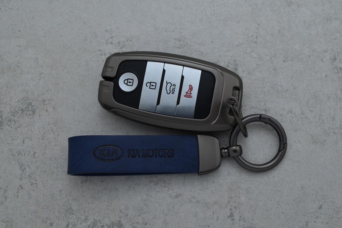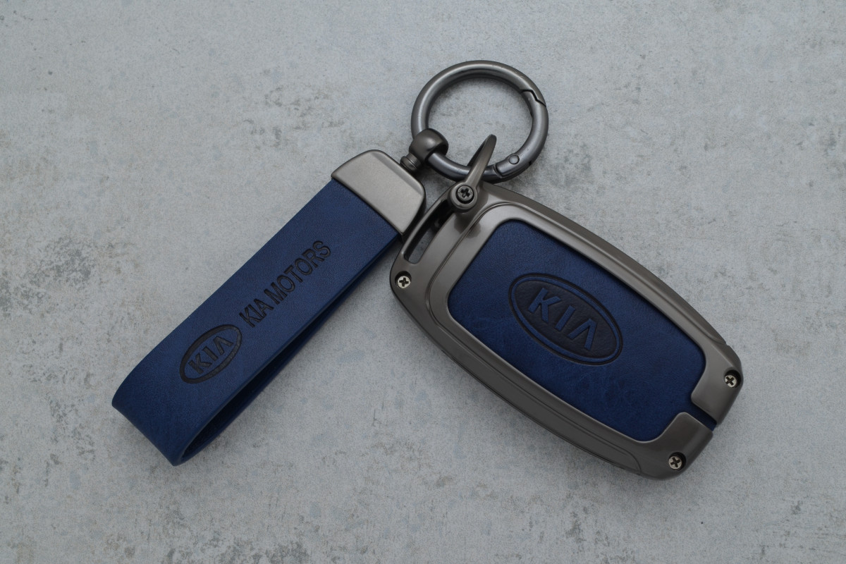 Чохол для автоключа KIA Soul графітовий метал із синьої шкіри — стильний та надійний аксесуар, що захищає ключ від подряпин, зносу та щоденних пошкоджень.