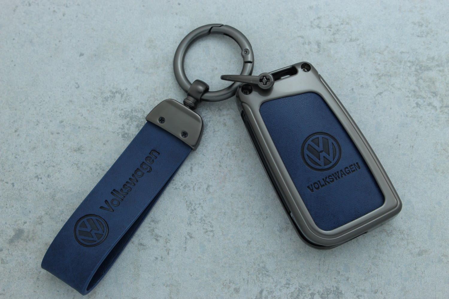 Чохол для автоключа Volkswagen 3 кнопки шкіряно-металевий графітово-синій — надійний і стильний аксесуар для захисту ключів VW від подряпин, зносу та щоденних пошкоджень.