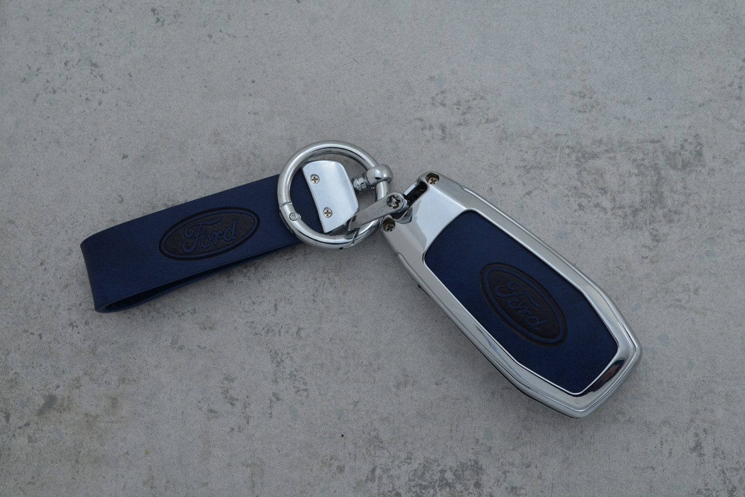 Чохол для автоключа Ford (Mondeo, Focus, Fiesta) синій зі шкіри та металу — стильний і міцний аксесуар, що захищає ключ від подряпин, зношування та повсякденних пошкоджень.