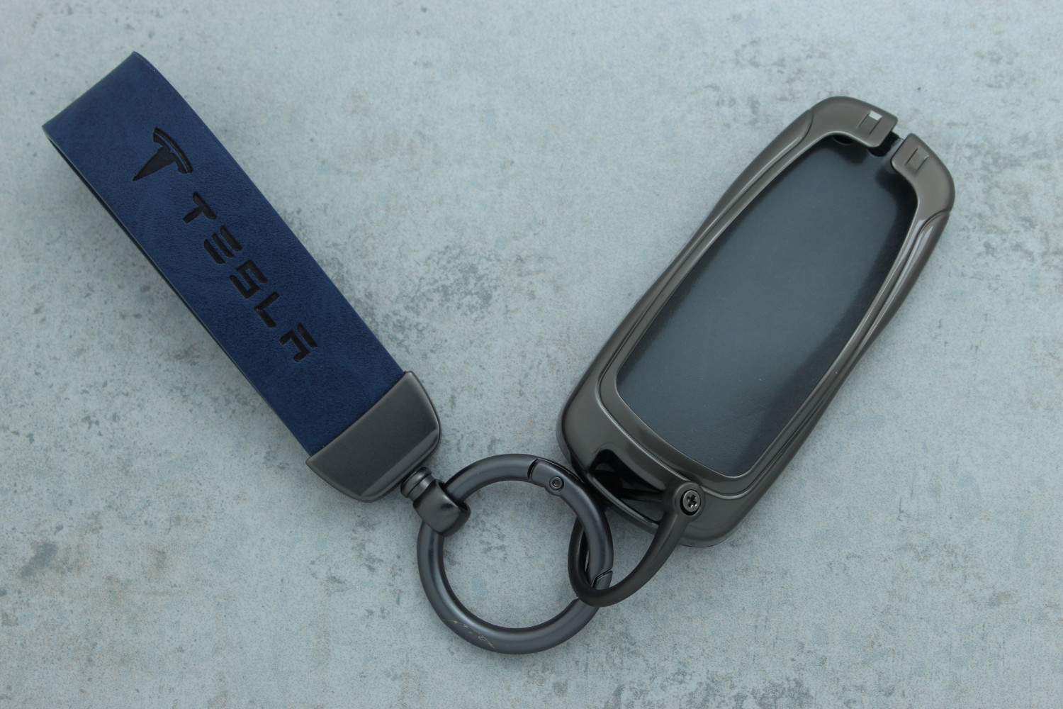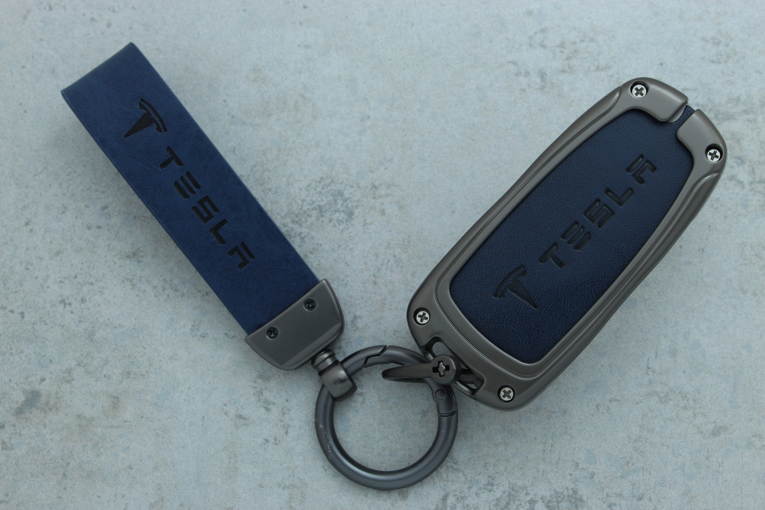 Чохол для ключа Tesla Model S графіт/синій метал + шкіра — стильний і надійний аксесуар, який захищає ключ від подряпин, ударів та щоденного зносу.