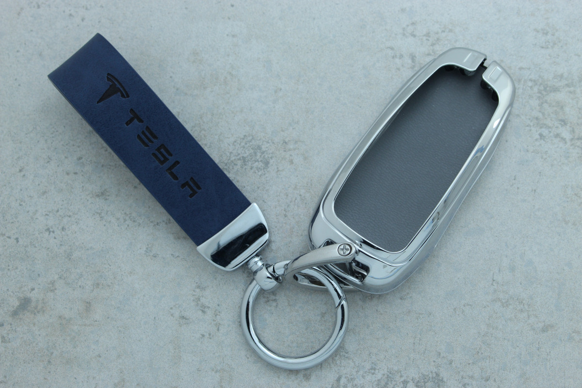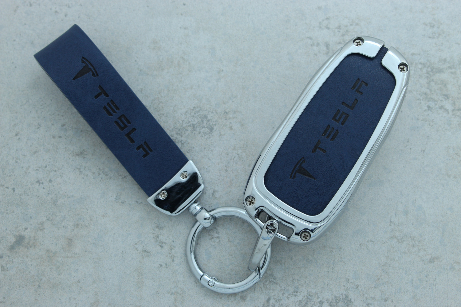 Чохол для ключа Tesla Model X синій метал + шкіра — надійний і стильний аксесуар, який захищає ключ від подряпин, зносу та щоденних пошкоджень.