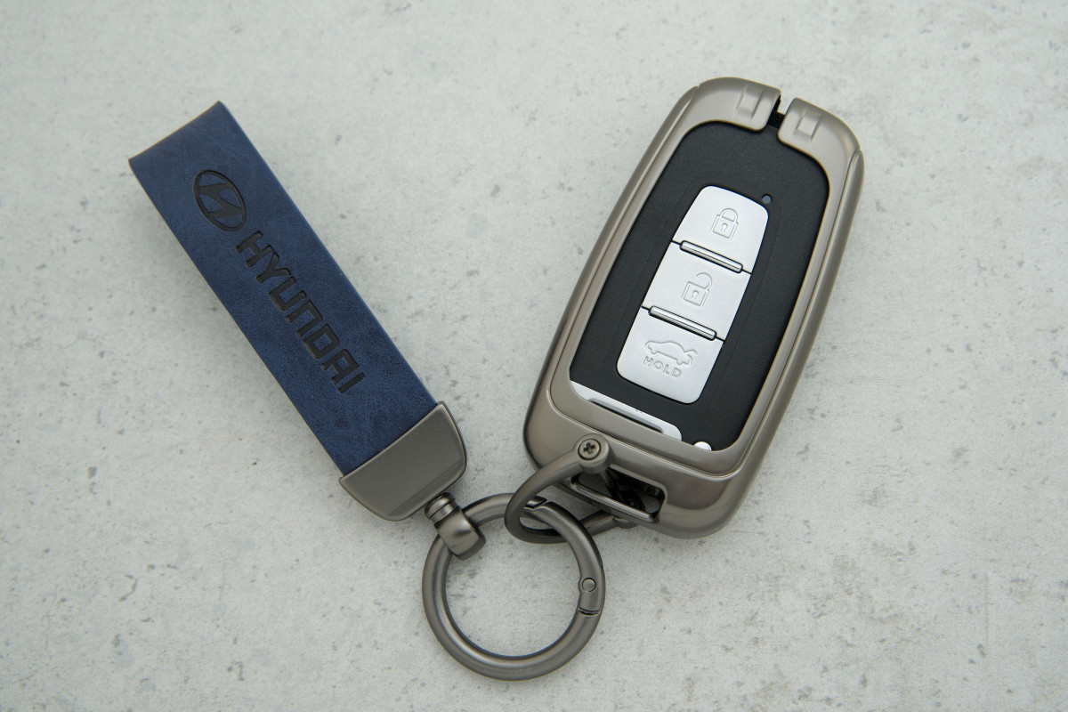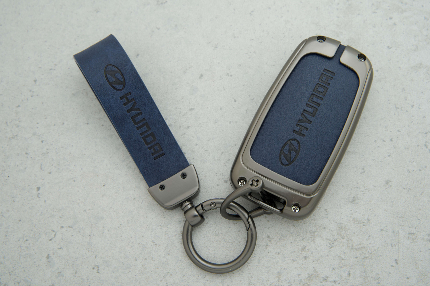Універсальний чохол для ключа Hyundai синього кольору з поєднанням шкіри та сірого металу — надійний захист ключа від подряпин, ударів та забруднень, який одночасно підкреслює стиль і преміальний вигляд.