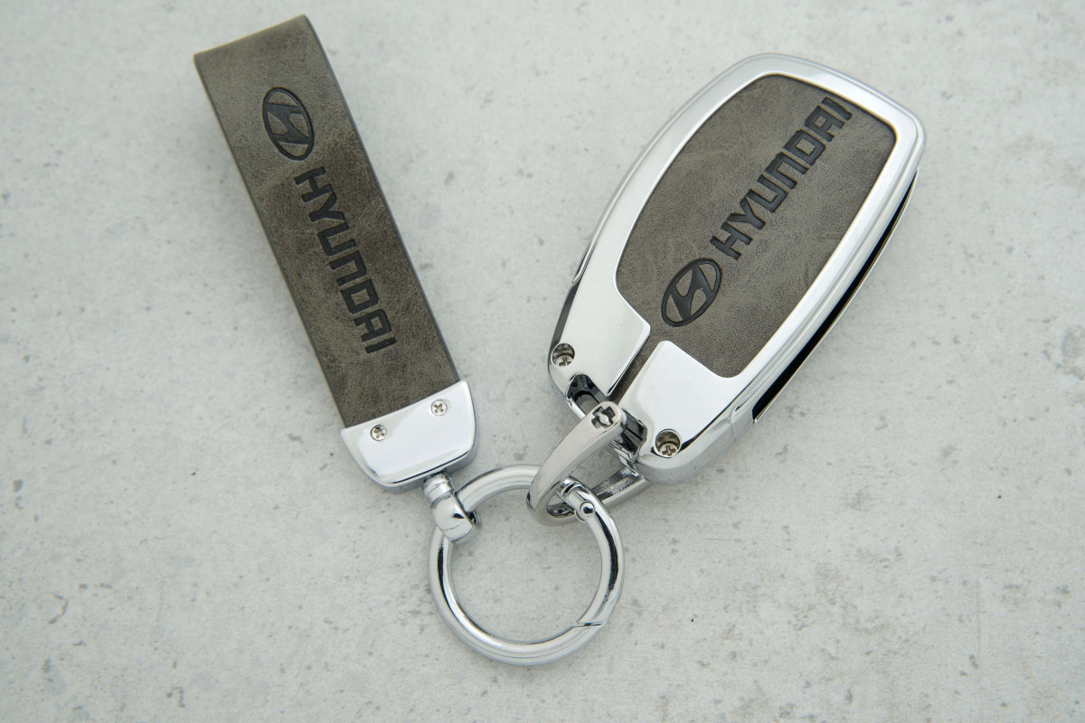 Чохол для ключа Hyundai (3/3+1 кнопка) для моделей Solaris, Accent та Elantra сірого кольору з натуральної шкіри та металевих вставок — надійний захист ключа від подряпин, ударів і забруднень, що водночас додає сучасного та преміального вигляду.