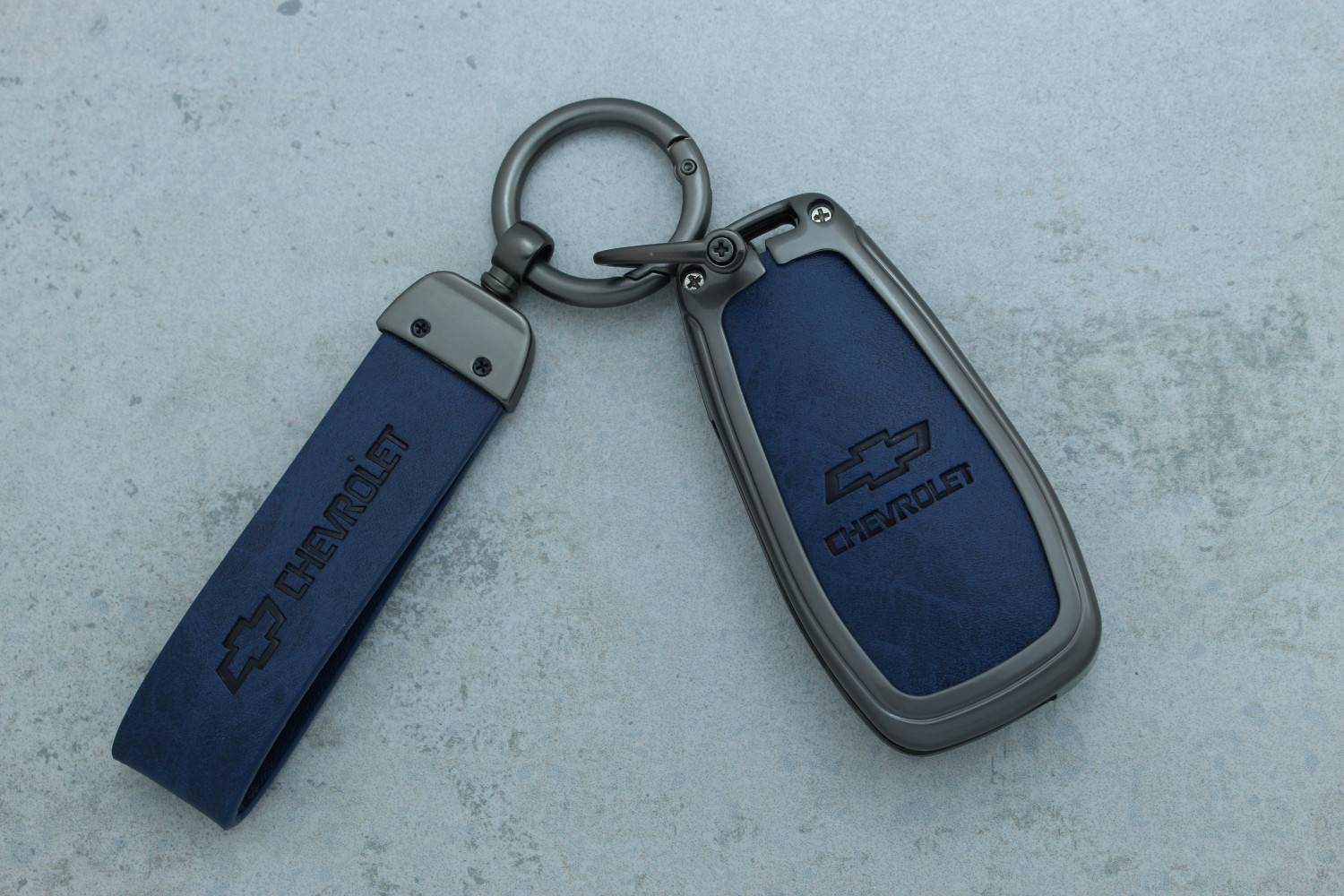 Чохол для автоключа Chevrolet Cover, графітовий метал у поєднанні з синьою шкірою — стильний та міцний аксесуар, що надійно захищає ключ від подряпин, зношування та щоденних пошкоджень.