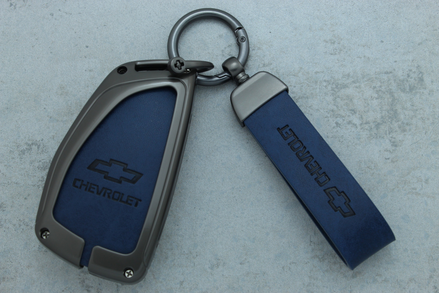 Чохол для автоключа Chevrolet Suburban / Tahoe (2021–2022) — FCC YG0G21TB2, 4 кнопки, сіра металева окантовка, синя шкіра — стильний та надійний аксесуар, що ефективно захищає ключ від подряпин, потертостей і механічних пошкоджень.