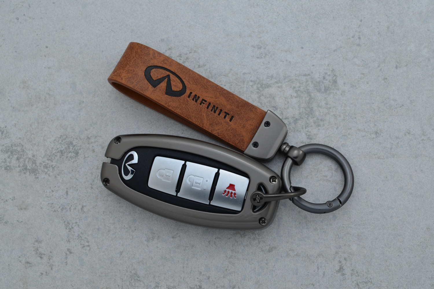 Чохол для автоключа Infiniti графітовий метал + коричнева шкіра — елегантний аксесуар, що поєднує преміальний стиль і надійний захист ключа від подряпин, потертостей і щоденних пошкоджень.