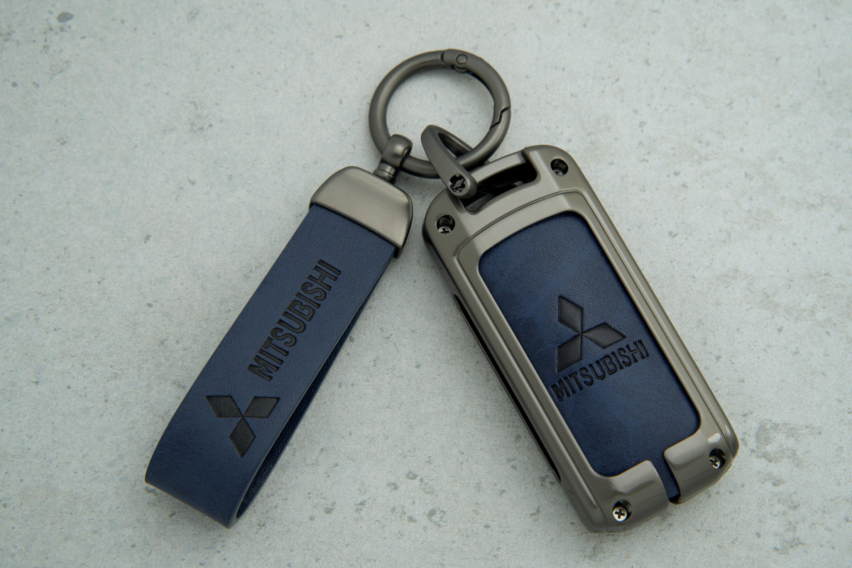 Чохол для автоключа Mitsubishi Outlander, Lancer 3 кнопки синя шкіра з графітовим металом — стильний і практичний аксесуар, що надійно захищає ключ від подряпин, потертостей і щоденного зносу.