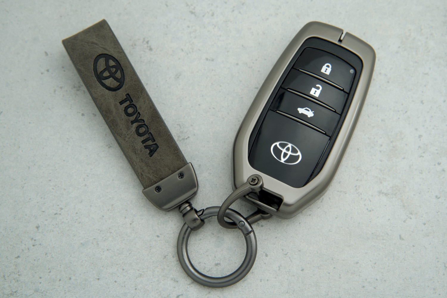 Чохол для ключа Toyota — універсальний аксесуар із поєднанням сірої шкіри та металевих елементів, створений для надійного захисту й стильного вигляду. Він підходить для більшості моделей ключів Toyota, ефективно оберігаючи їх від подряпин, ударів і зносу.