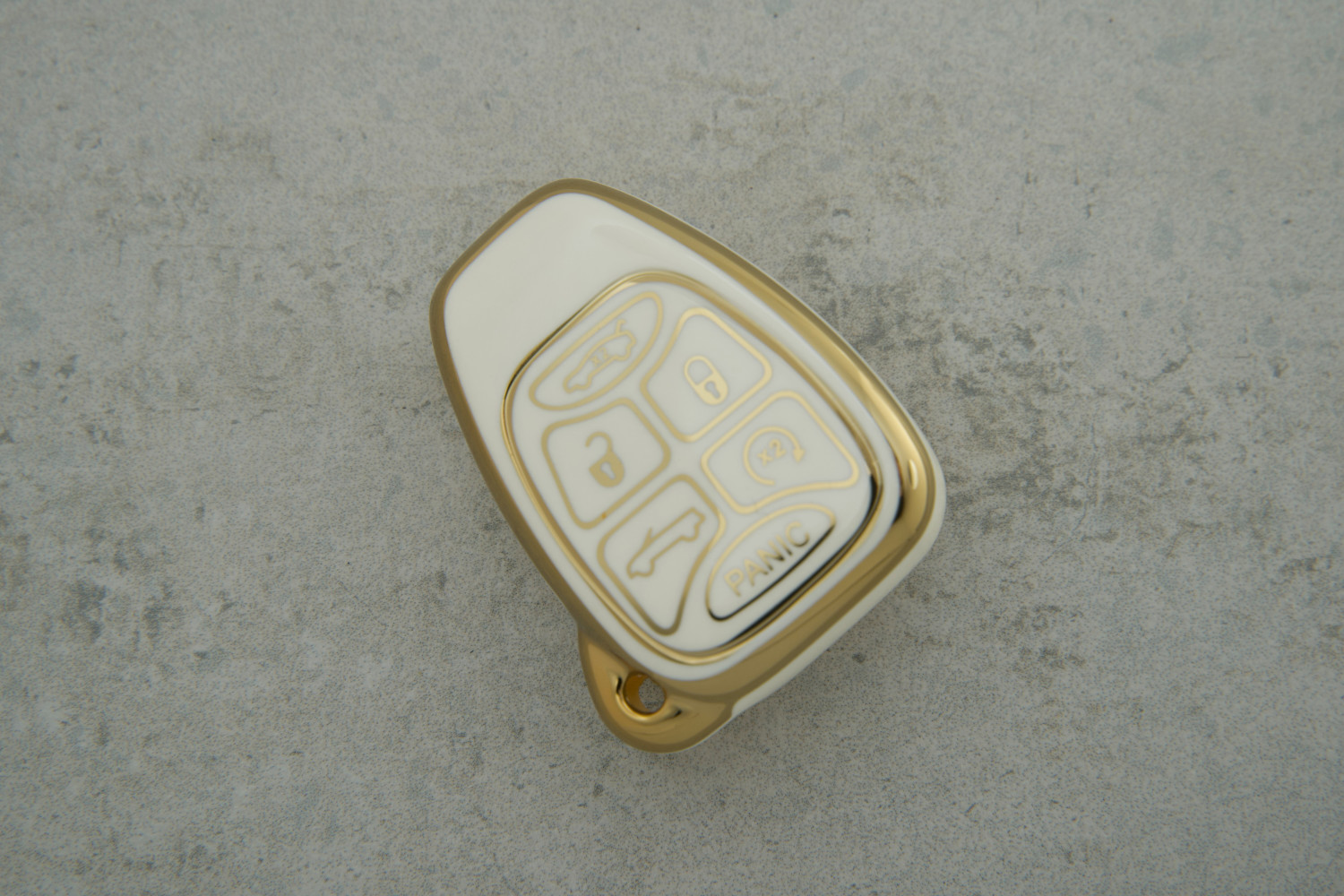 Чохол для ключа Jeep / Chrysler 5 кнопок + 1 паніка білий поліуретан — функціональний аксесуар для надійного захисту ключа від механічних пошкоджень, забруднень і щоденного зносу зі збереженням повної працездатності.