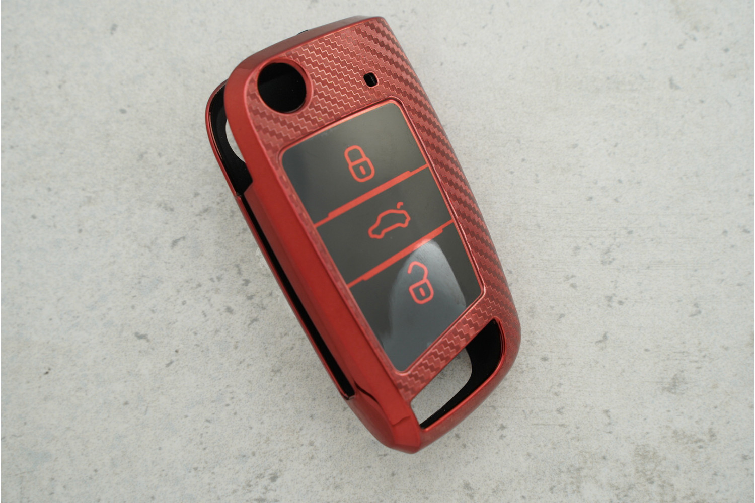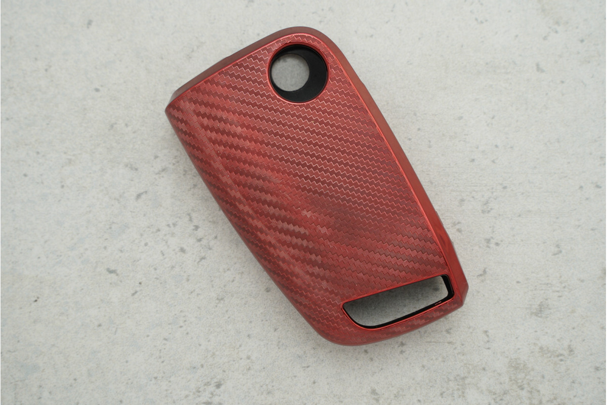 Чохол для автоключа Volkswagen Passat 3 кнопки з червоною карбоновою текстурою — компактний поліуретановий захист, що оберігає ключ від подряпин, потертостей та щоденного зносу.