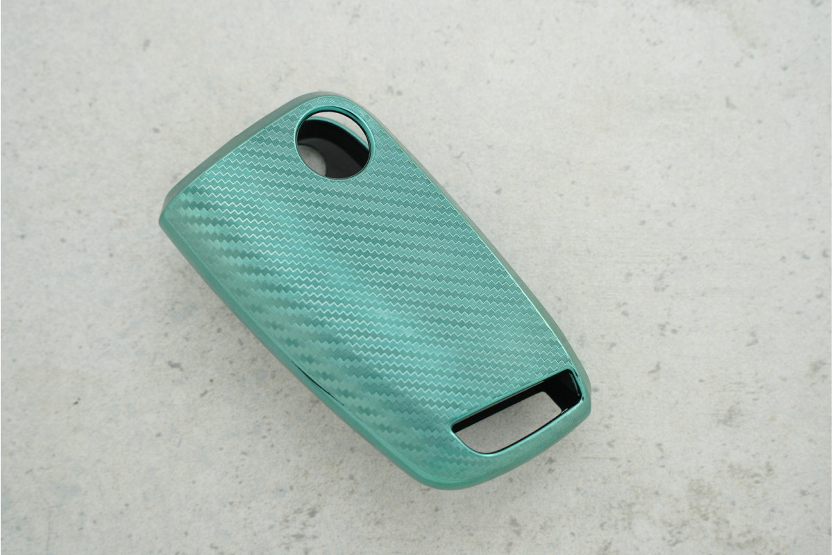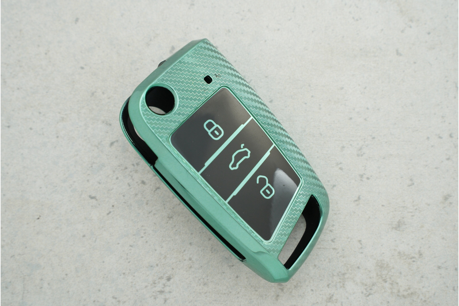 Чохол для автоключа Volkswagen Passat 3 кнопки із зеленим карбоновим покриттям — компактний поліуретановий аксесуар для захисту ключа від подряпин, потертостей та щоденного зносу.