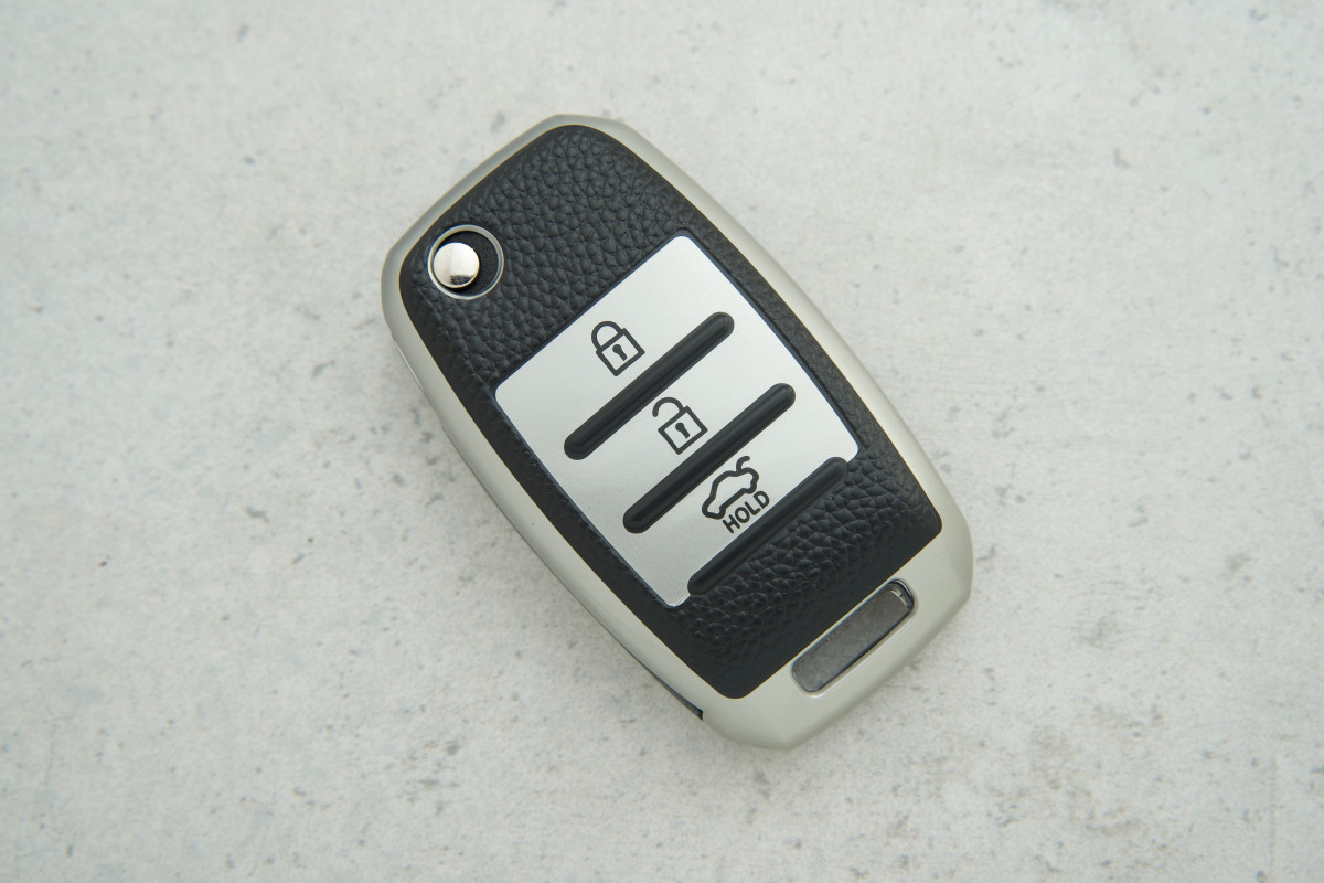 Чохол для автоключа Kia Sportage (Америка) з 3 кнопками у кольорі срібло, виготовлений із якісного поліуретану, — це стильний і практичний аксесуар, що ефективно захищає ваш ключ від подряпин, потертостей і пошкоджень.