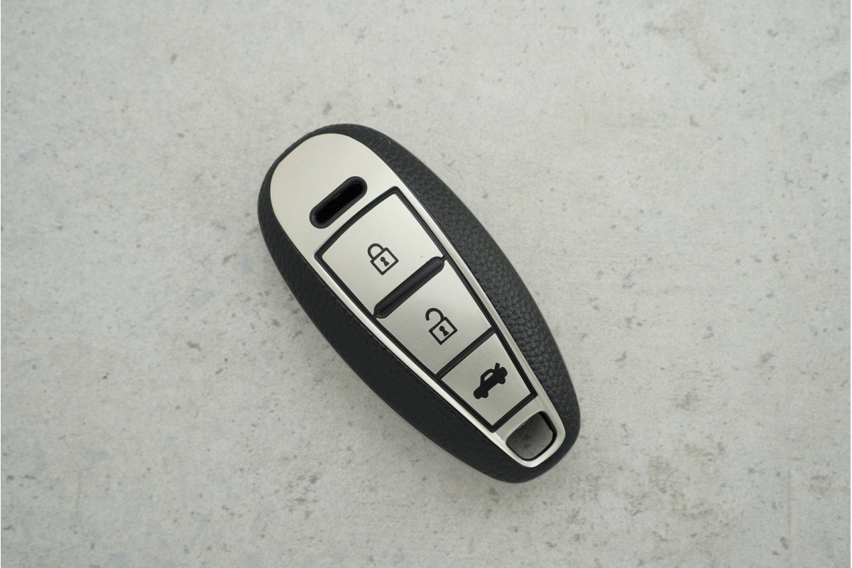 Чохол для автоключа Suzuki (Vitara, Fengyu, Qiyue, Xiaotu) 3 кнопки чорного кольору з сріблястими елементами — міцний поліуретановий аксесуар, що захищає ключ від подряпин, потертостей та щоденного зносу.