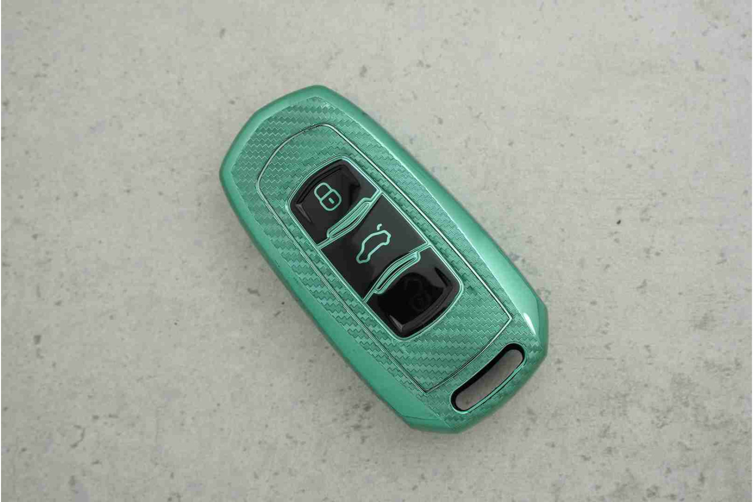 Чохол для автоключа Geely Атлас / NL3 / EX7 — зелений карбон, 3 кнопки, практичний аксесуар, що надійно захищає ключ від подряпин, потертостей та щоденних ушкоджень. Текстура «карбон» додає приємний тактильний ефект і сучасний вигляд, а матеріал забезпечує комфортне користування.