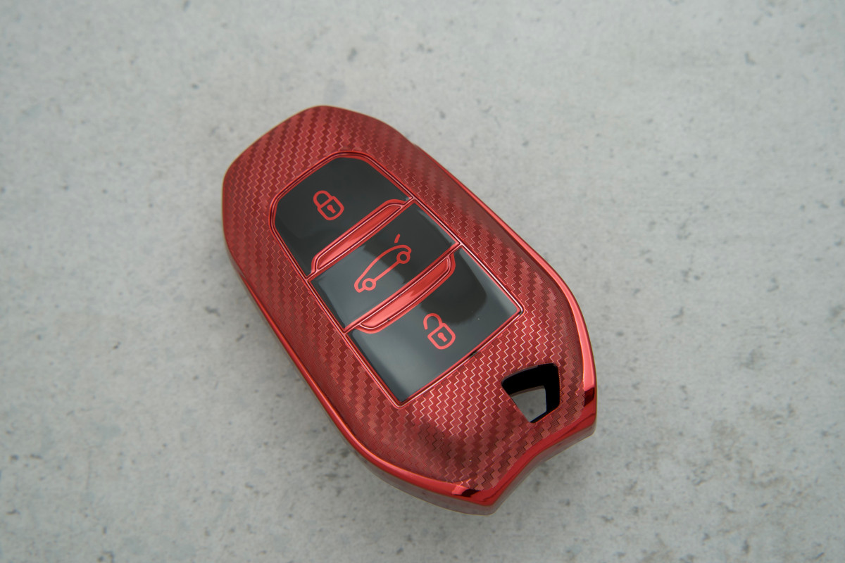 Чохол для ключа Peugeot 3 кнопки (з багажником) червоний карбон — надійний та стильний аксесуар для захисту вашого ключа від подряпин, потертостей та забруднень.