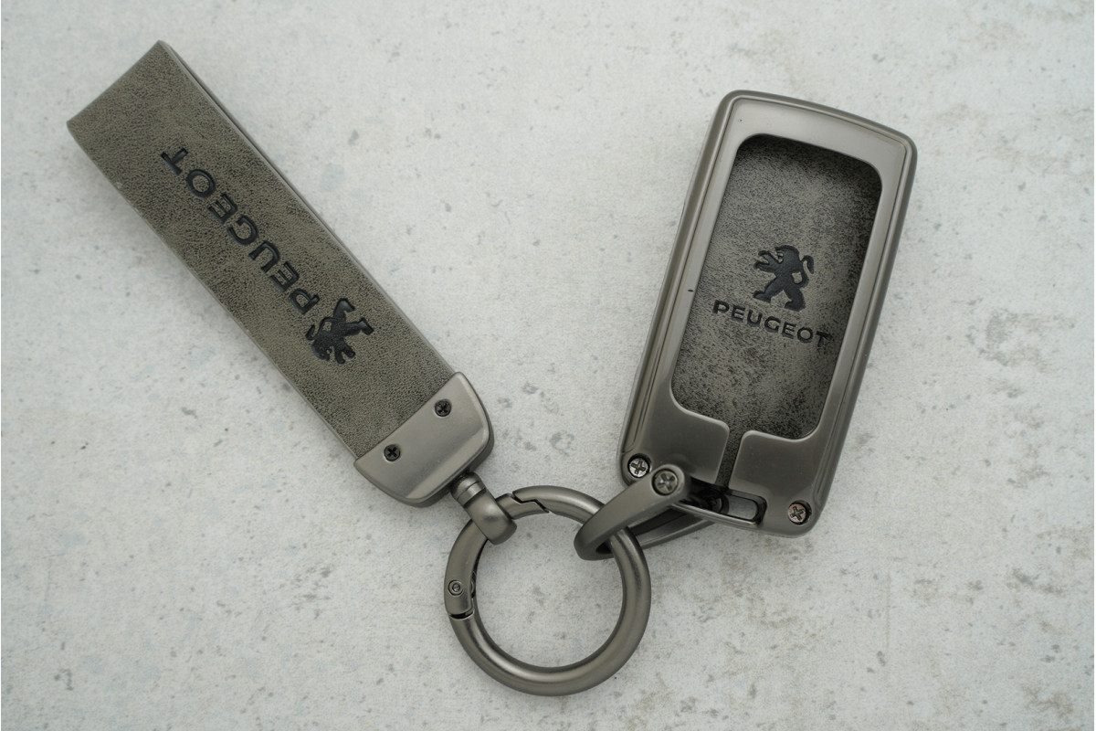 Чохол для ключа Peugeot універсальний, виконаний у поєднанні сірого металу та сірої шкіри — стильний та практичний аксесуар для захисту ключа і оновлення його зовнішнього вигляду.
