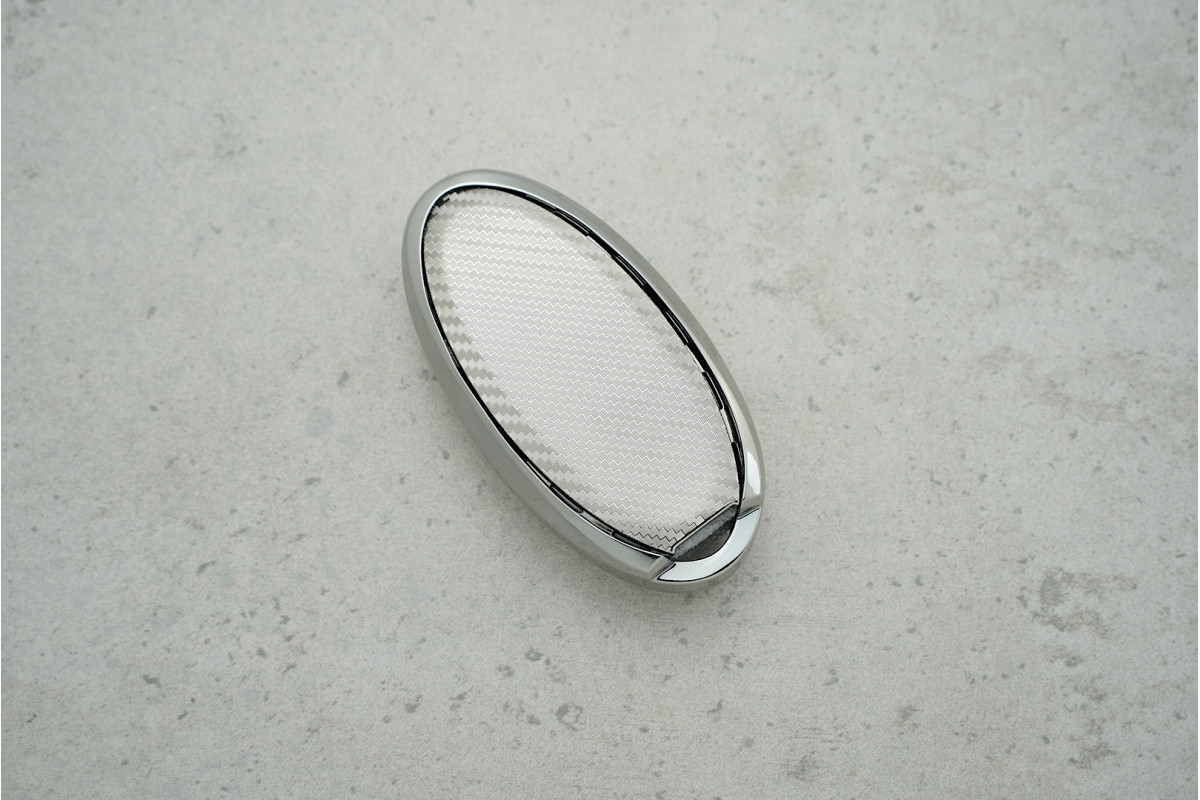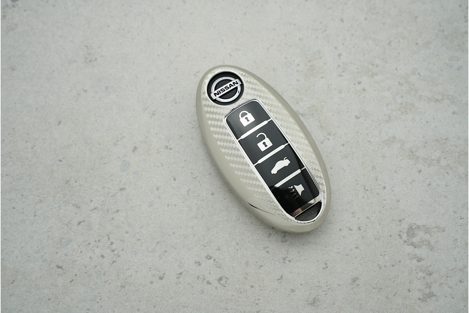 Чохол для автоключа Nissan 3+1 кнопки (Qashqai J10/J11, Juke, X-Trail) сріблястий поліуретановий з карбоновим візерунком — сучасний і надійний аксесуар, що захищає ключ від подряпин, ударів та щоденного зносу.